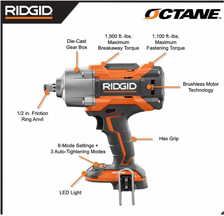 RIDGID R86211KN 18-Volts Brushless Cordless 1/2 in. High Torque 6-Mode Impact Wrench Kit with 4.0 Ah Battery and Charger