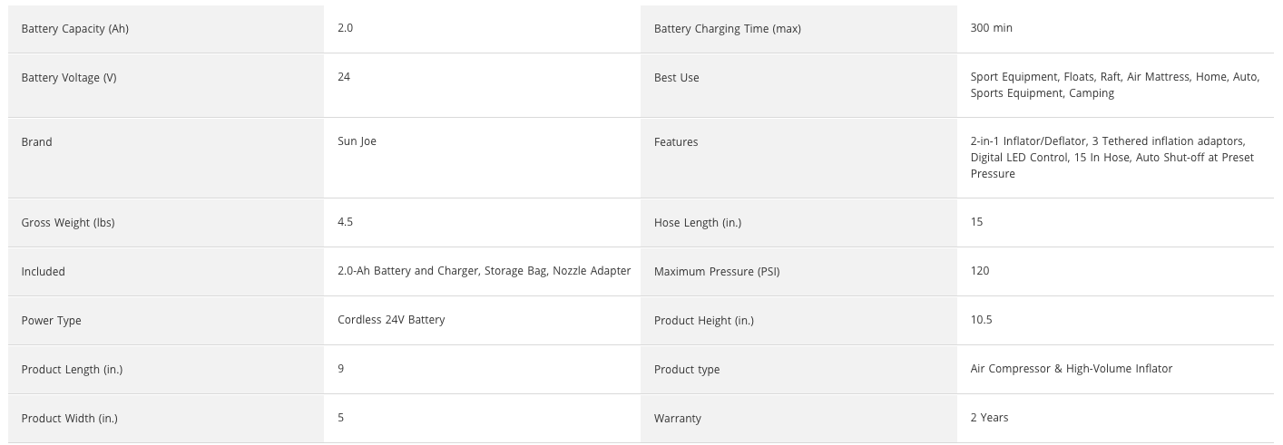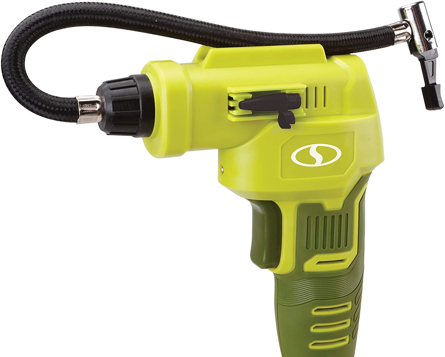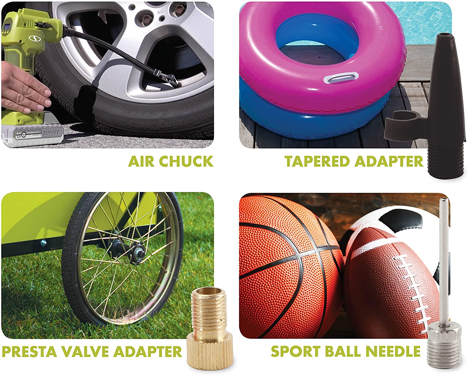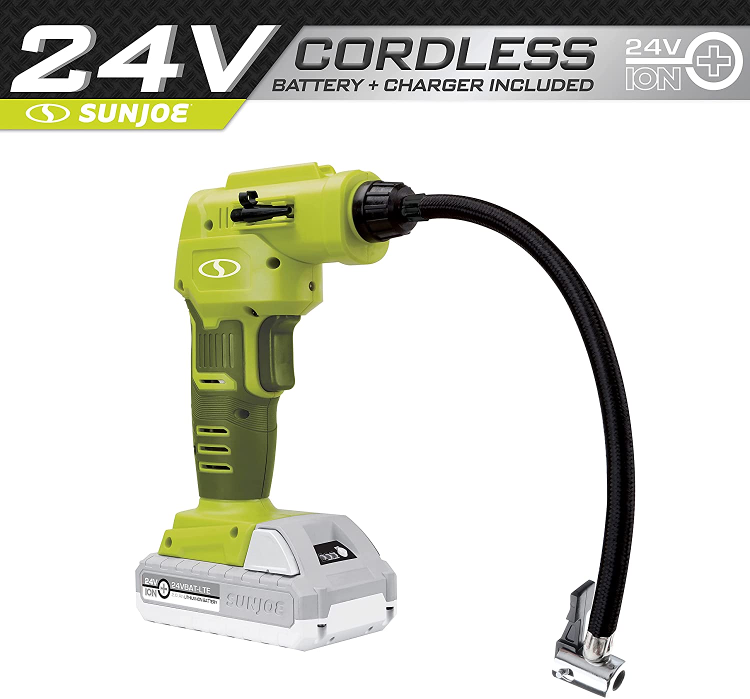 Sun Joe 24V-AJC-AJV-LTE 24V iON+ High Volume Inflator & Portable Air Compressor Kit | w/ 2.0-Ah Battery + Charger. Storage Bag. 3 Inflation Adapters. and Nozzle Pin Attachments
