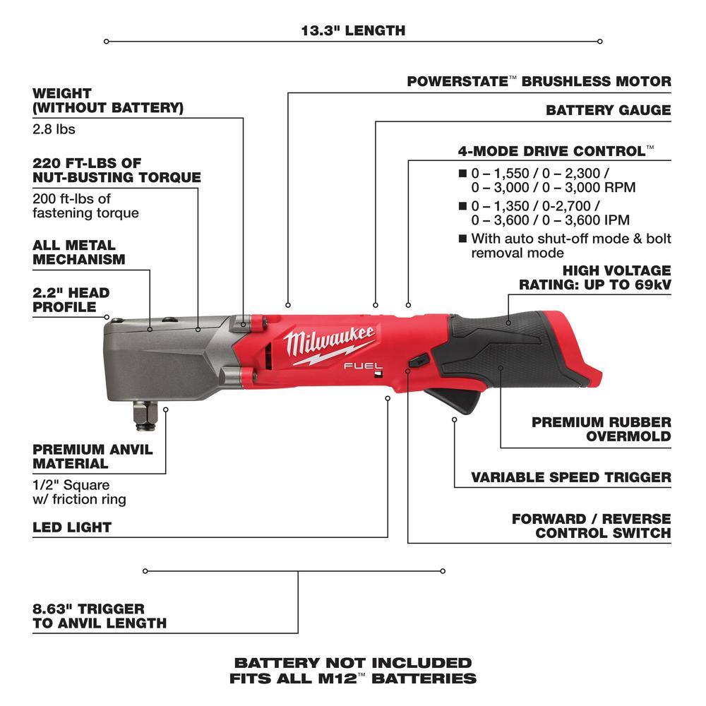 Milwaukee 2564-20-2565-20 M12 FUEL 12V Lithium-Ion Brushless Cordless 3/8 in. and 1/2 in. Right Angle Impact Wrenches Set (2-Tool)