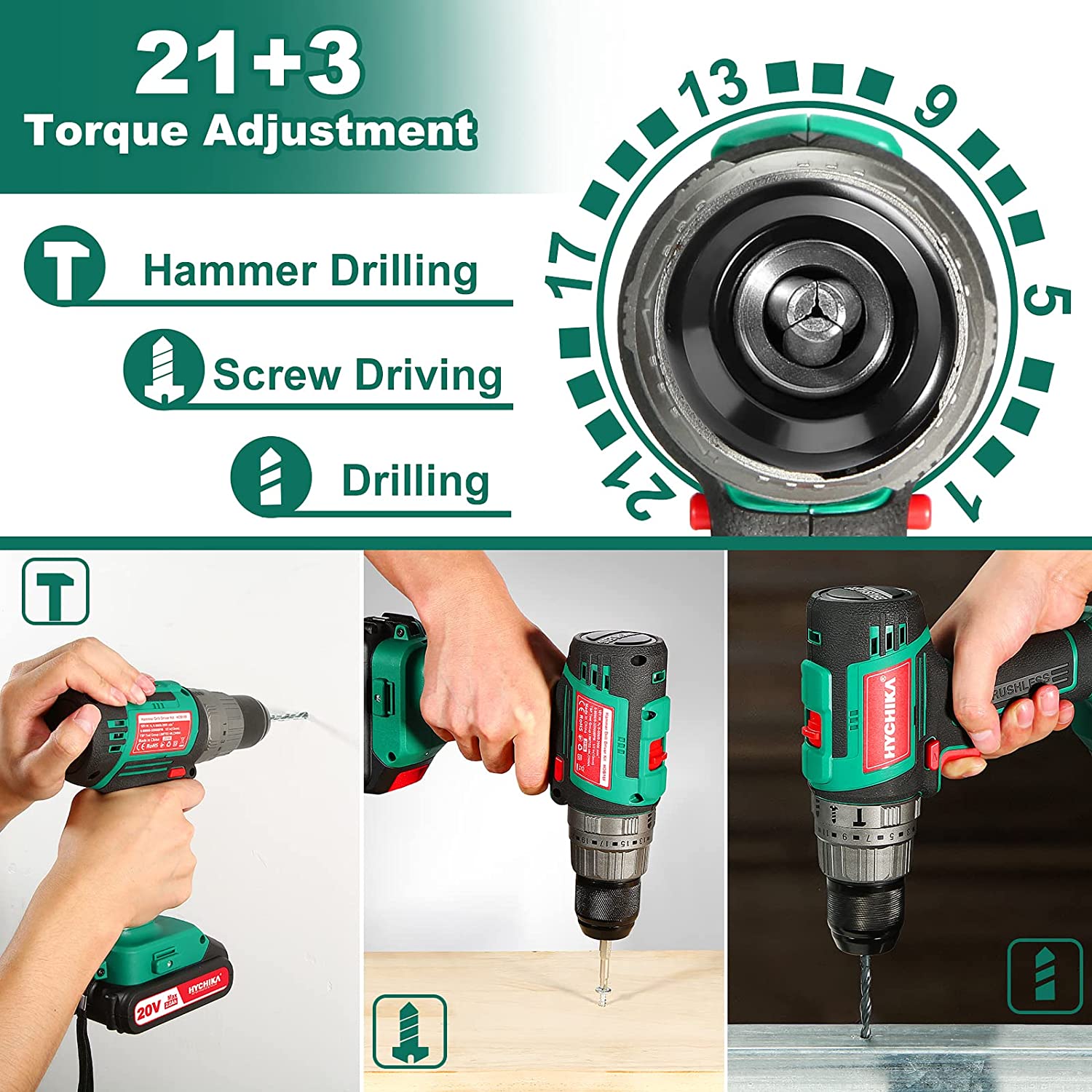 HYCHIKA 1/2-in 20-volt Max-Amp Variable Speed Brushless Cordless Hammer Drill (1-Battery Included)