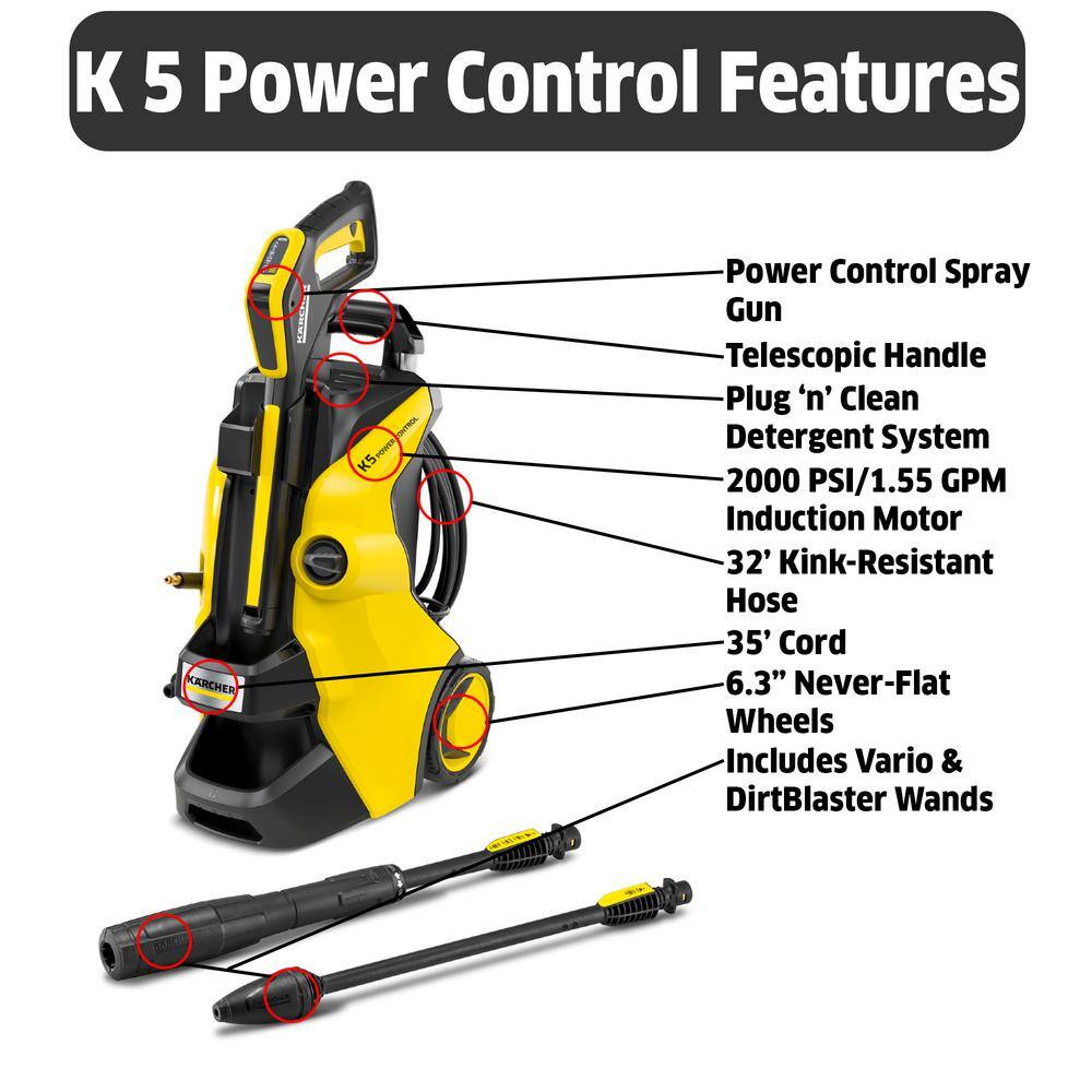 Karcher 1.324-568.0 2000 PSI 1.55 GPM K 5 Power Control Cold Water Electric Induction Pressure Washer Plus Vario and DirtBlaster Spray Wands