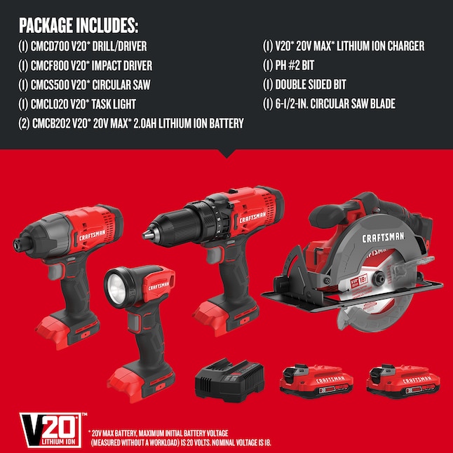CRAFTSMAN CMCK401D2 V20 4-Tool 20-volt Max Power Tool Combo Kit Case (2 Li-ion Batteries Included and Charger Included)