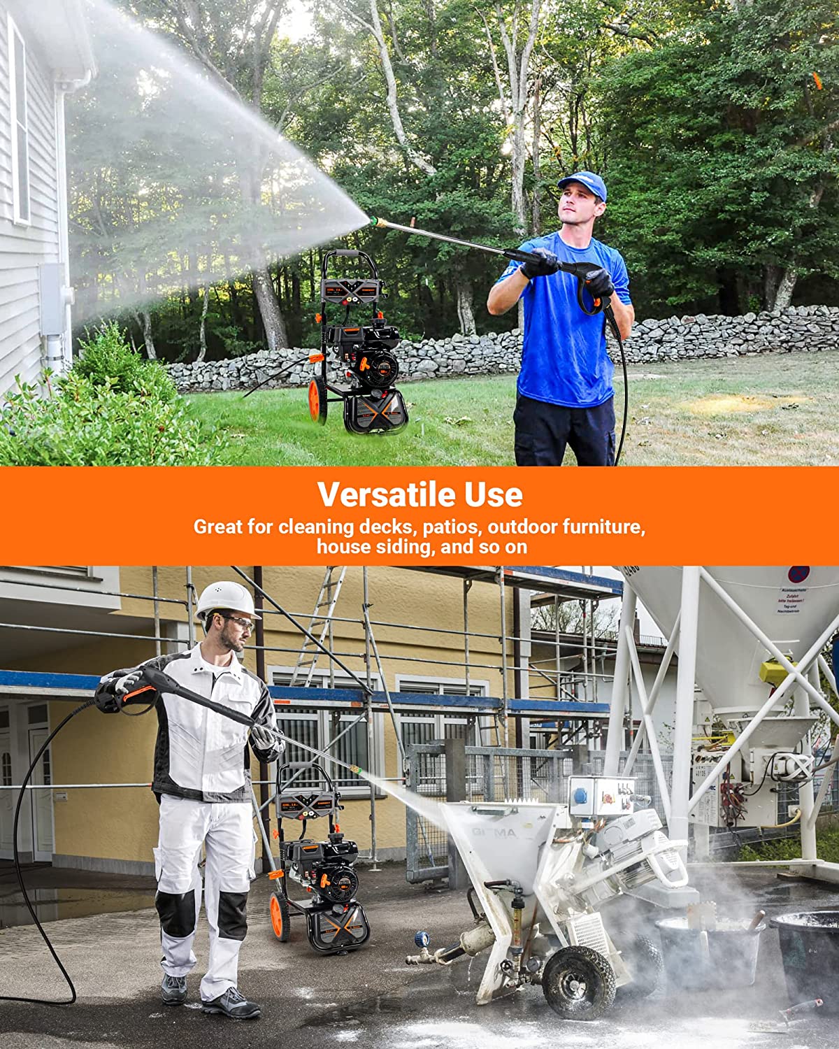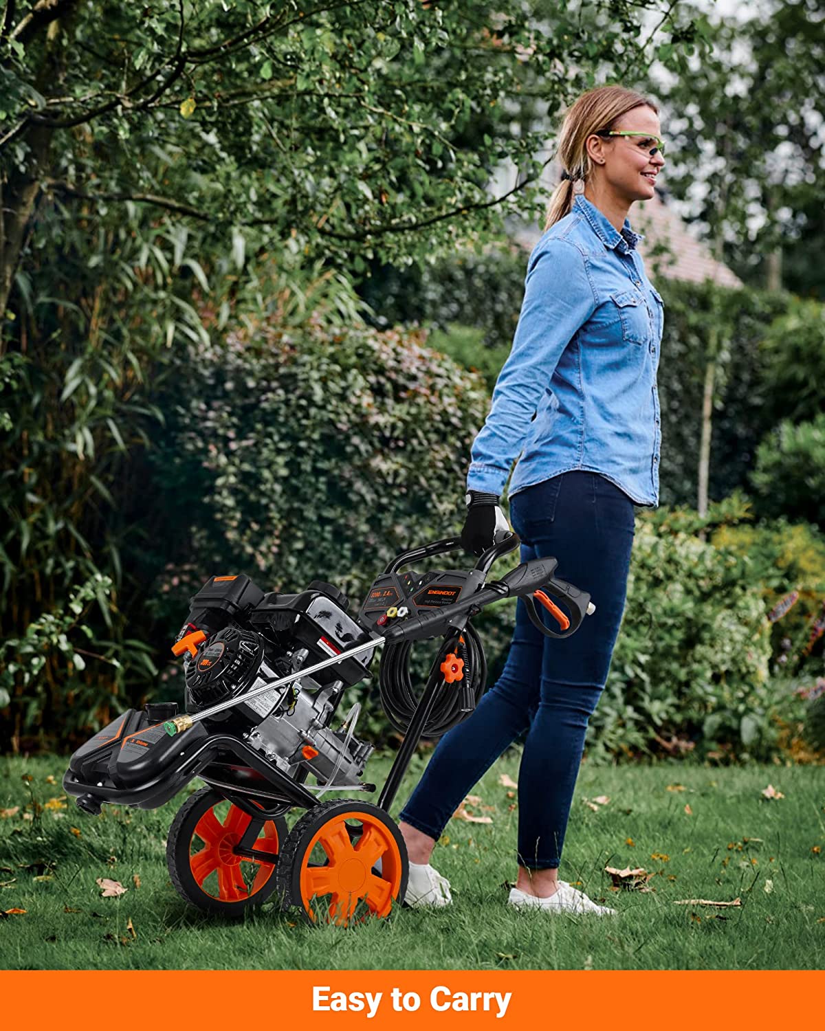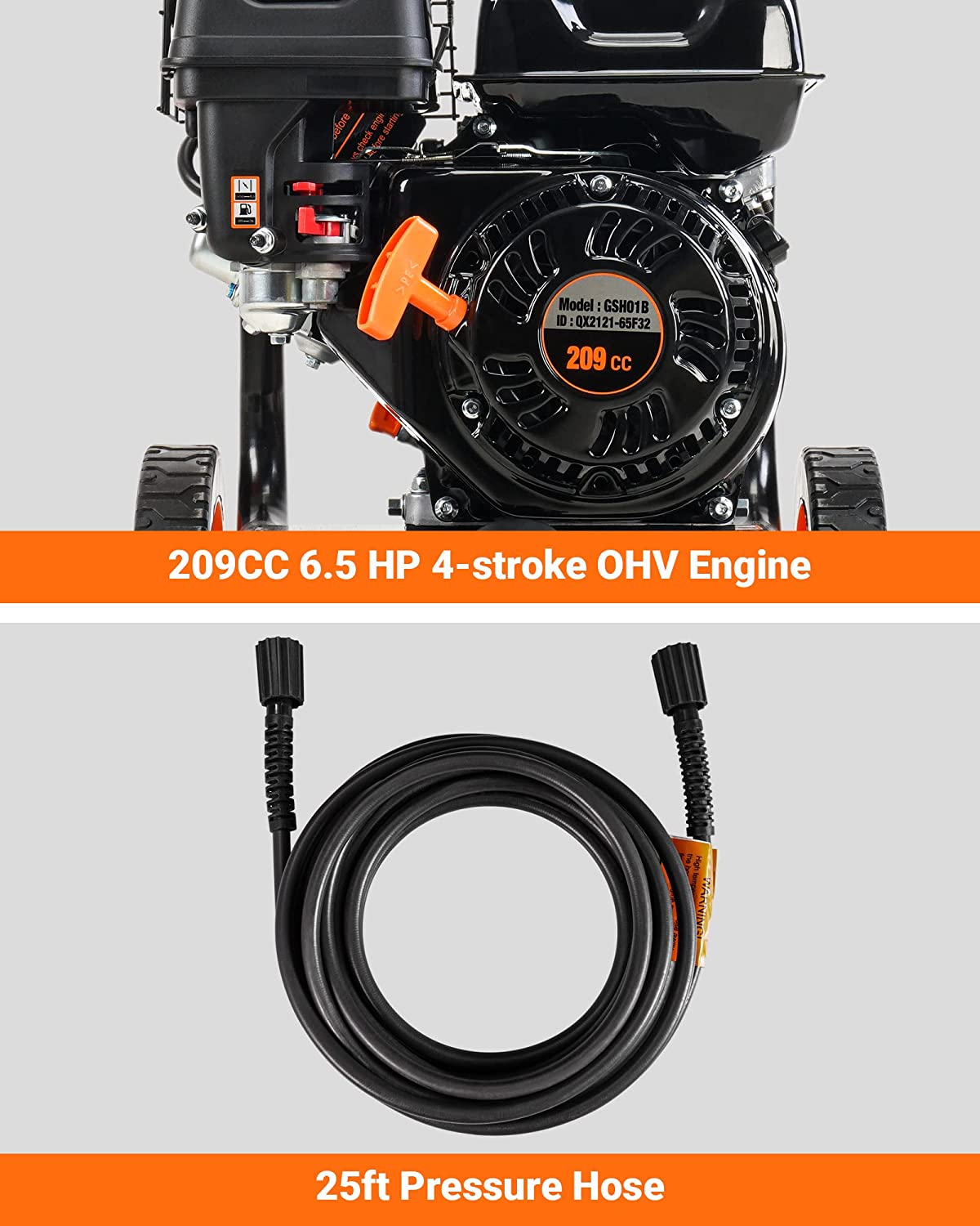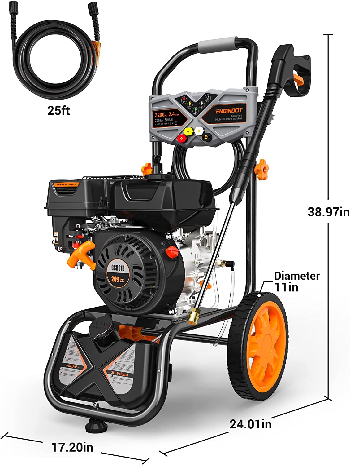 Gas Pressure Washer. ENGiNDOT 3200 PSI / 2.4 GPM Outdoor Power Equipment with 209CC 4-Stroke OHV Engine. Pressure Washer Includes Soap Tank. 5 QC Nozzles. CARB Compliant - GSH01B