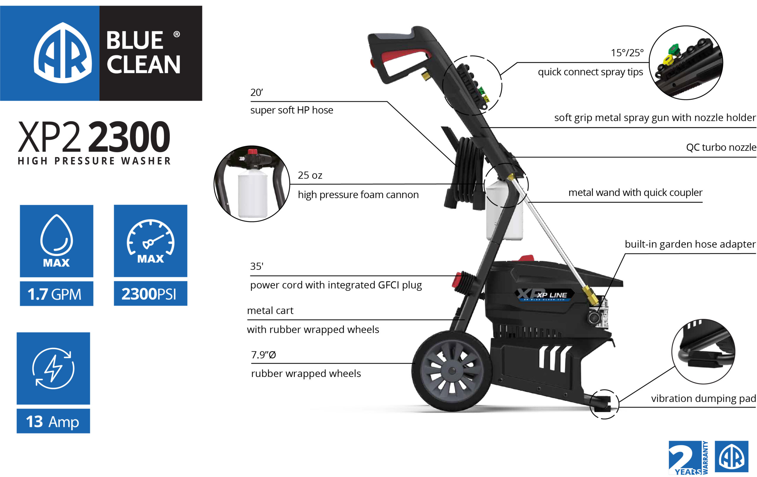 AR Blue Clean BCXP22300P Electric Pressure Washer - 2300 PSI. 1.7 GPM. 13 Amps
