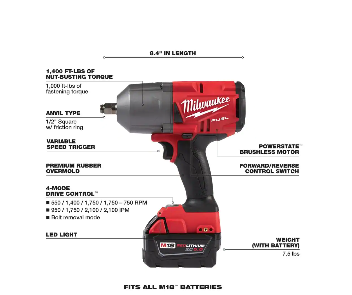 Milwaukee 2767-21B M18 FUEL 18V Lithium-Ion Brushless Cordless 1/2 in. Impact Wrench w/Friction Ring Kit w/One 5.0 Ah Battery and Bag