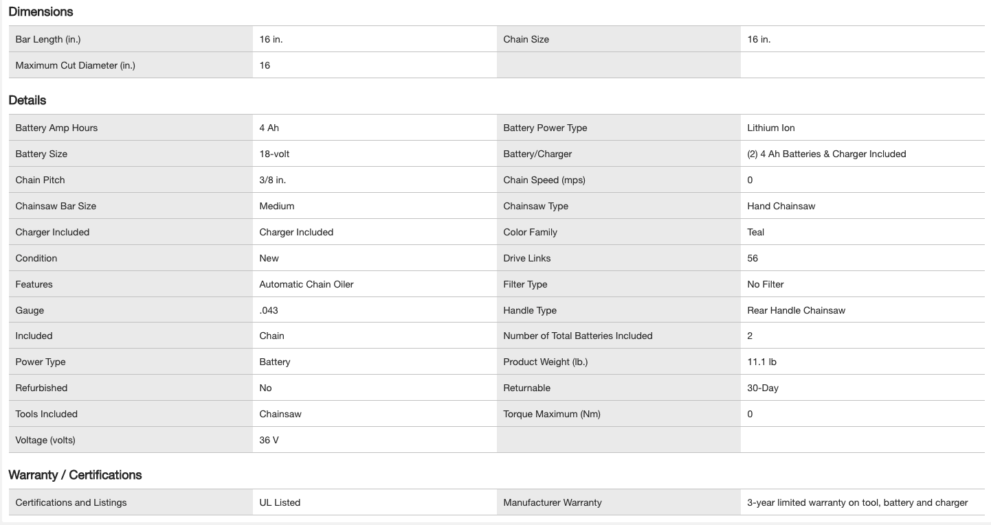 Makita XCU04CM 18-Volt X2 (36V) LXT Lithium-Ion Brushless Cordless 16 in. Electric Chain Saw Kit (4.0Ah)