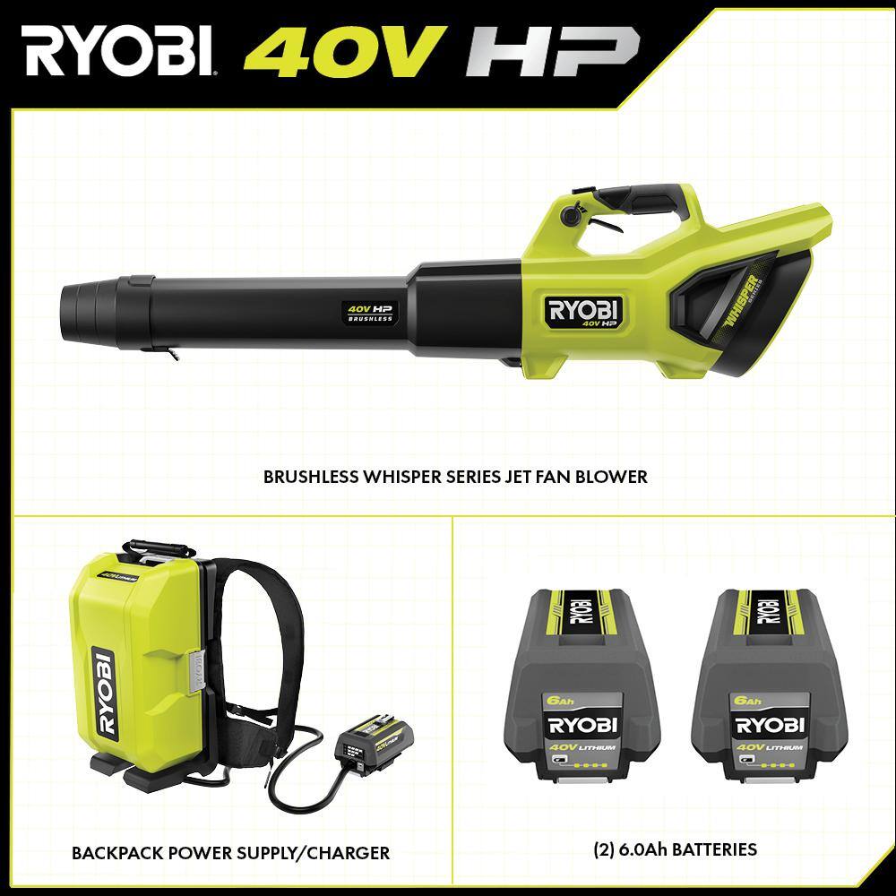 RYOBI RY404180 40V HP Brushless Whisper Series 190 MPH 730 CFM Blower and Backpack Battery w/ (2) 6.0 Ah Batteries & Charger