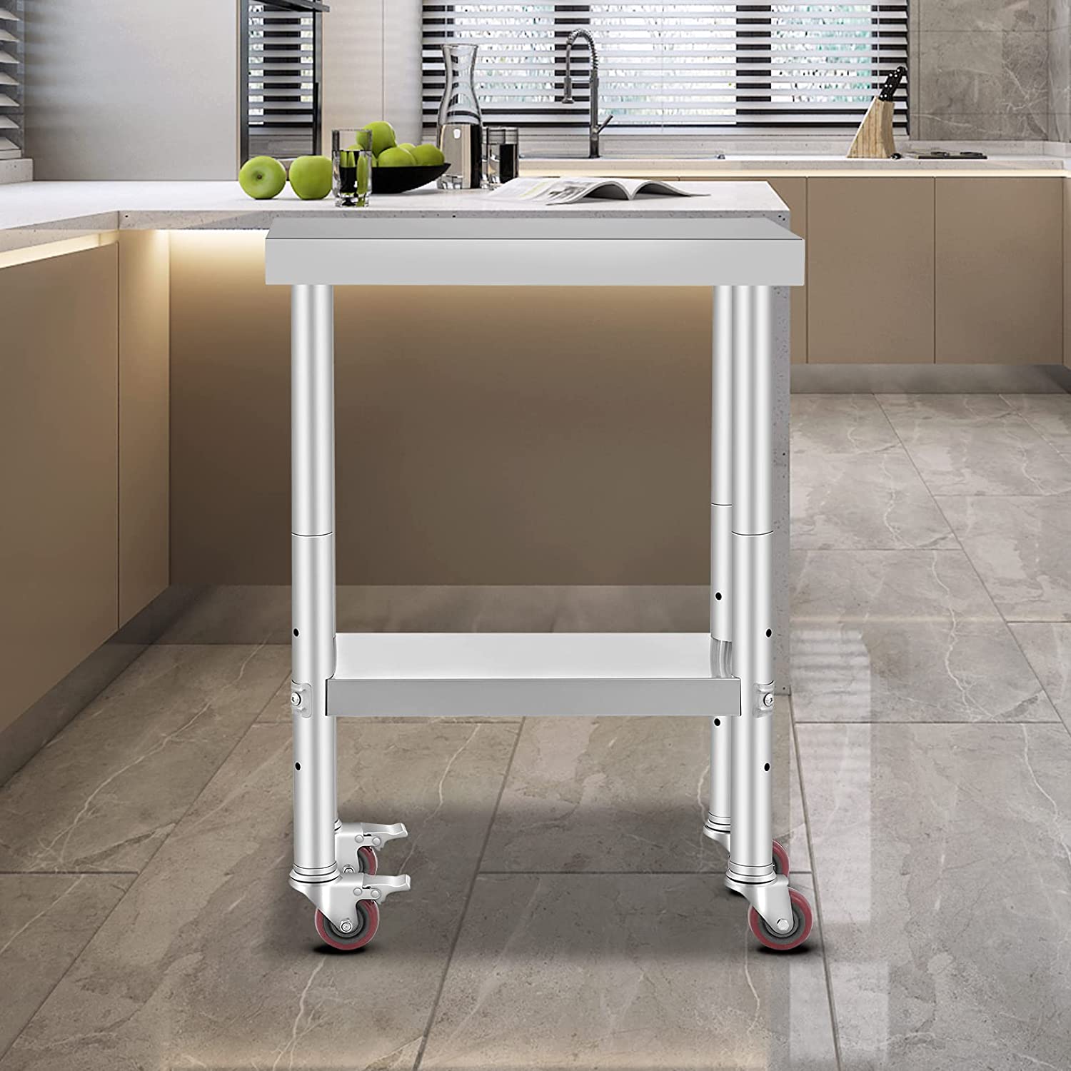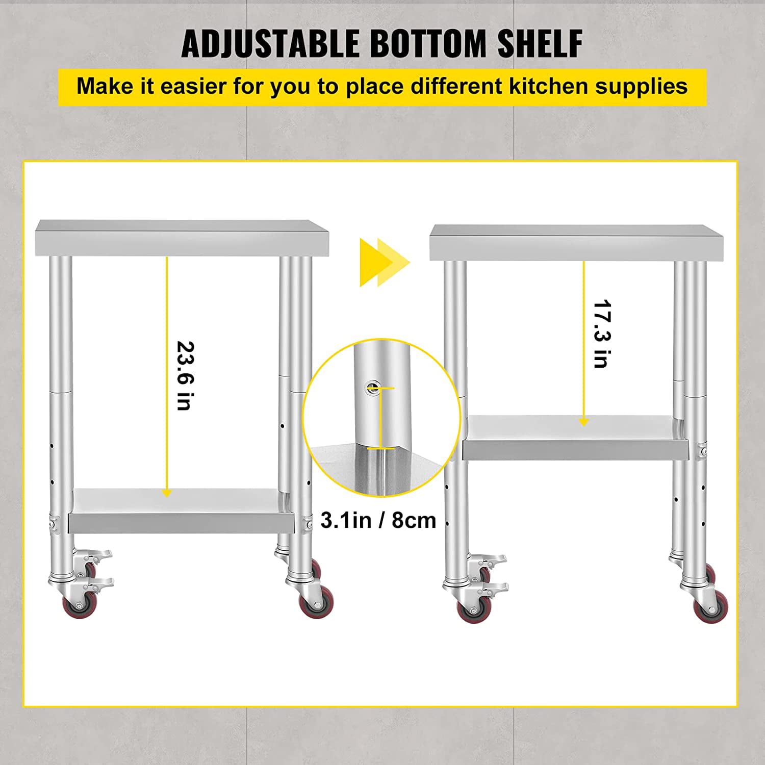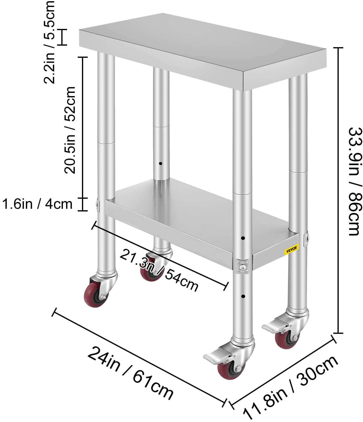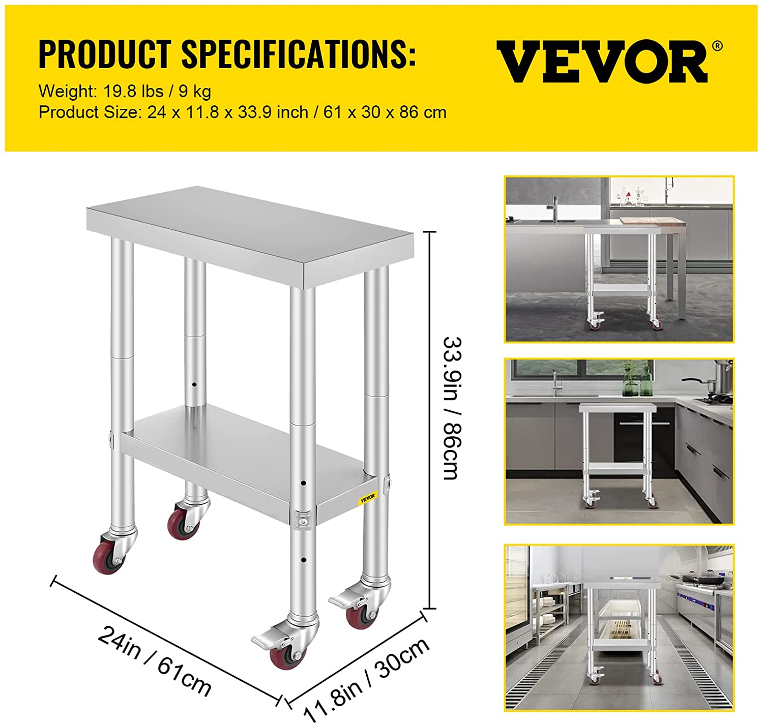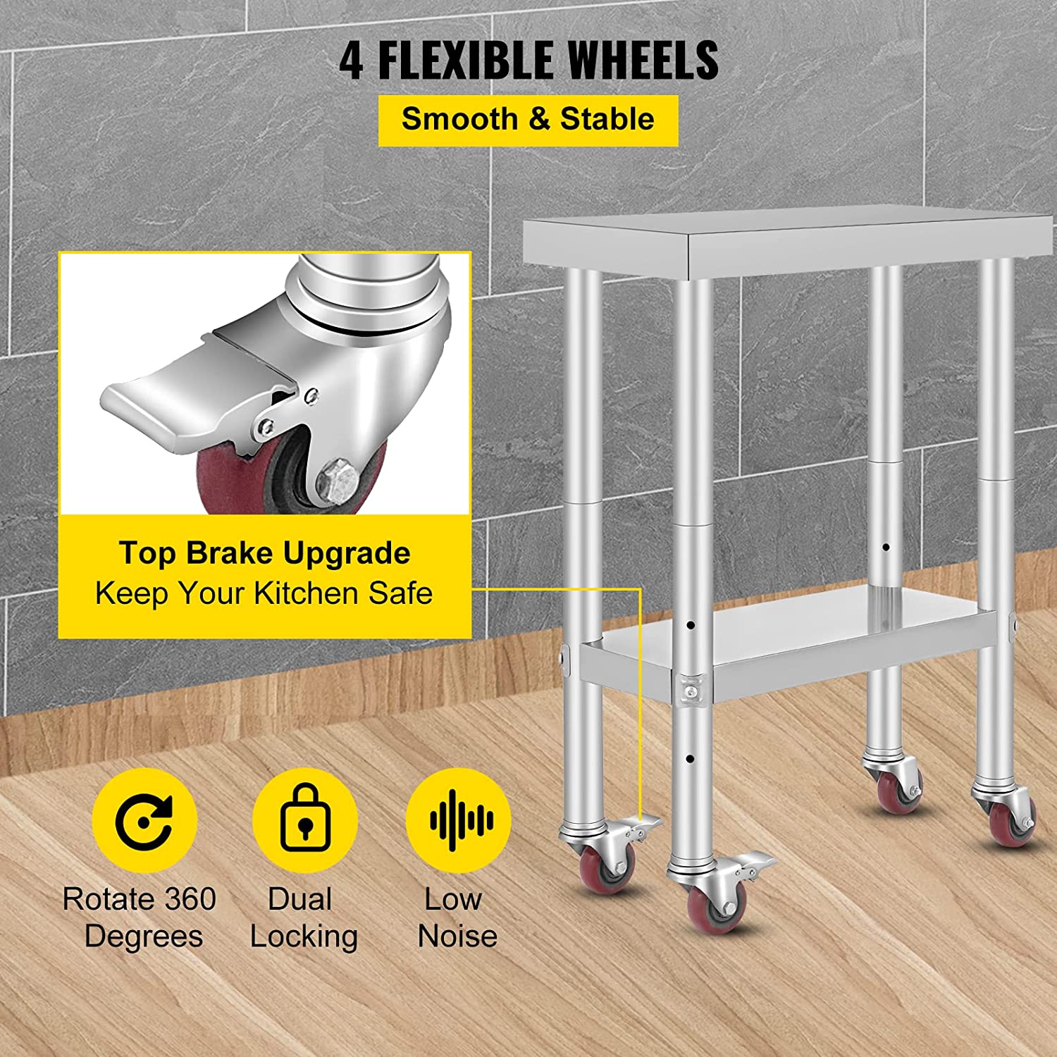VEVORbrand Stainless-Steel Work Table 24 x 12 Inches with 4 Wheels for Commercial Kitchen Restaurant