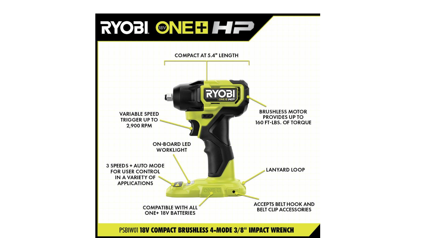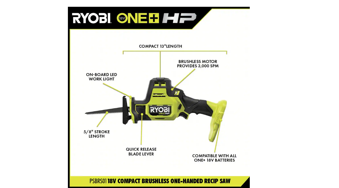 RYOBI PSBDD01K-PSBRS01B-PSBIW01B ONE+ HP 18V Brushless Cordless Compact 1/2 in. Drill/Driver. One-Handed Reciprocating Saw. Impact Wrench. (2) Batteries. Charger