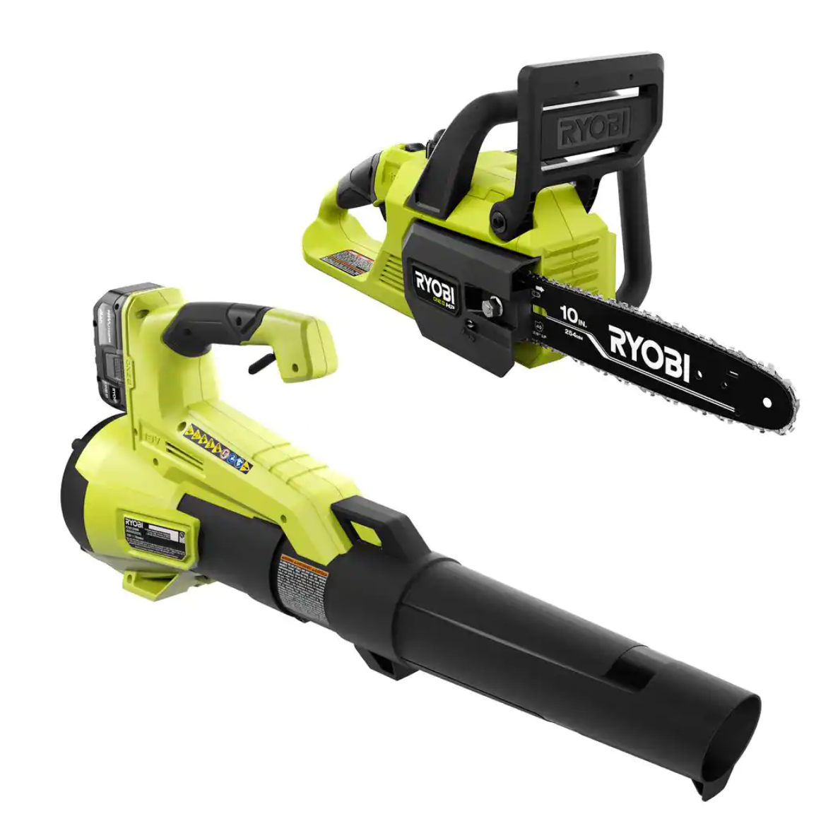 RYOBI P2520-BLW ONE+ HP 18V Brushless 10 in. Cordless Battery Chainsaw and 110 MPH 350 CFM Leaf Blower with 4.0 Ah Battery and Charger