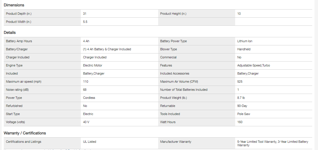 RYOBI RY40480VNM-PS 40V 110 MPH 525 CFM Jet Fan Leaf Blower and 10 in. Pole Saw with 4.0 Ah Battery and Charger
