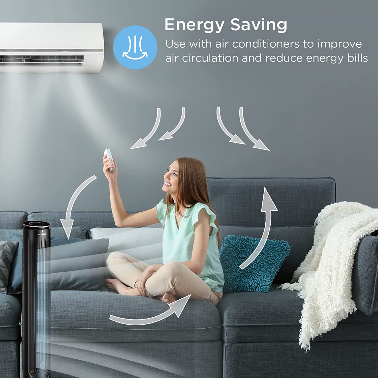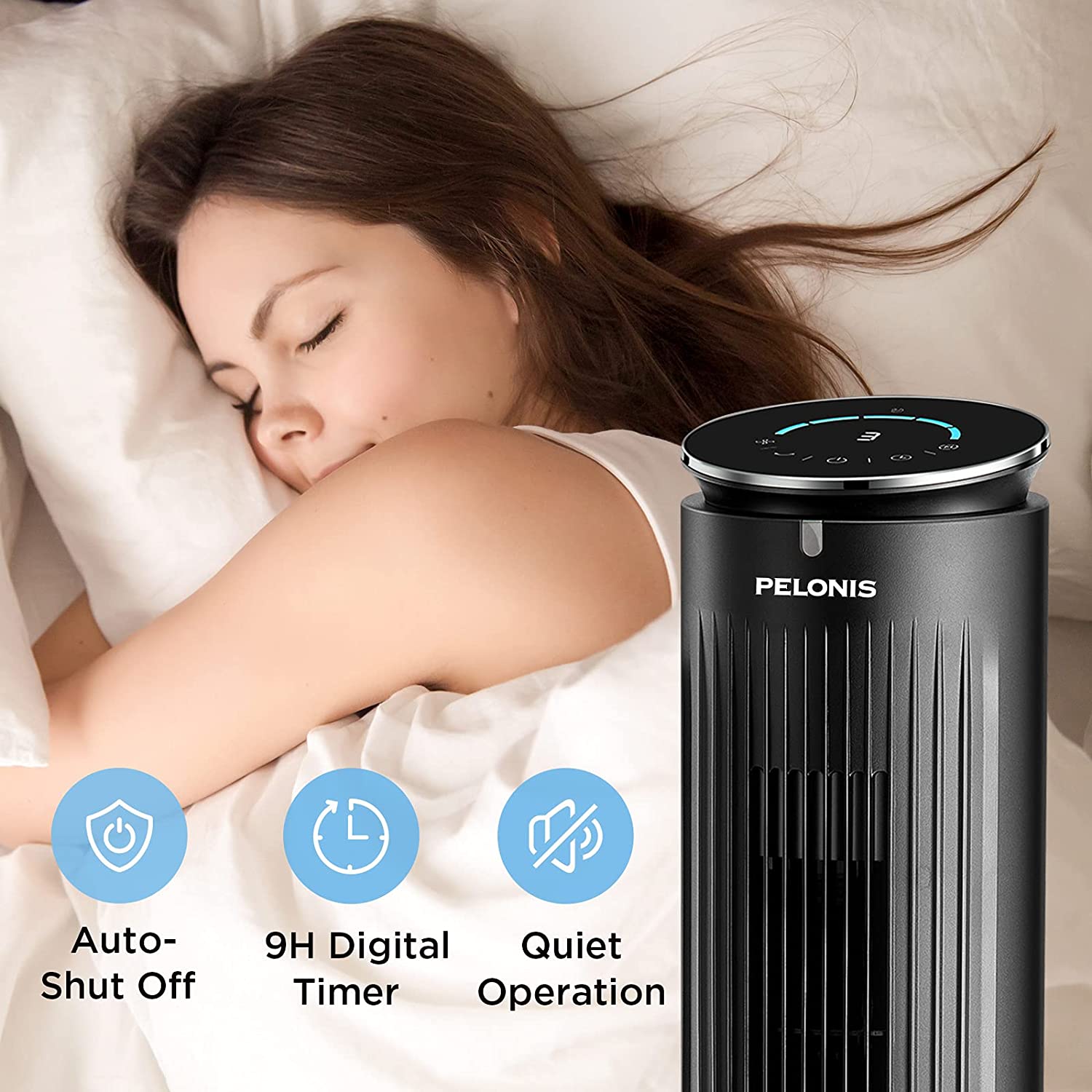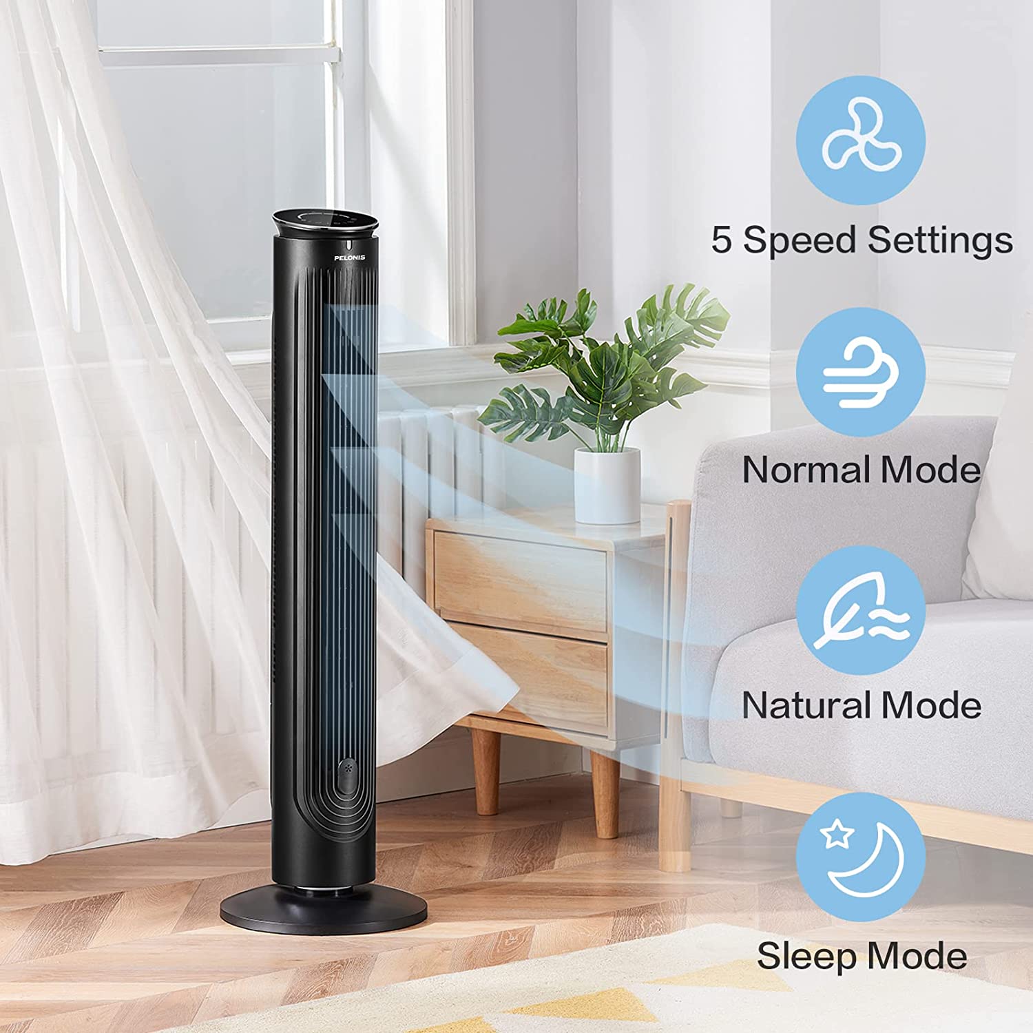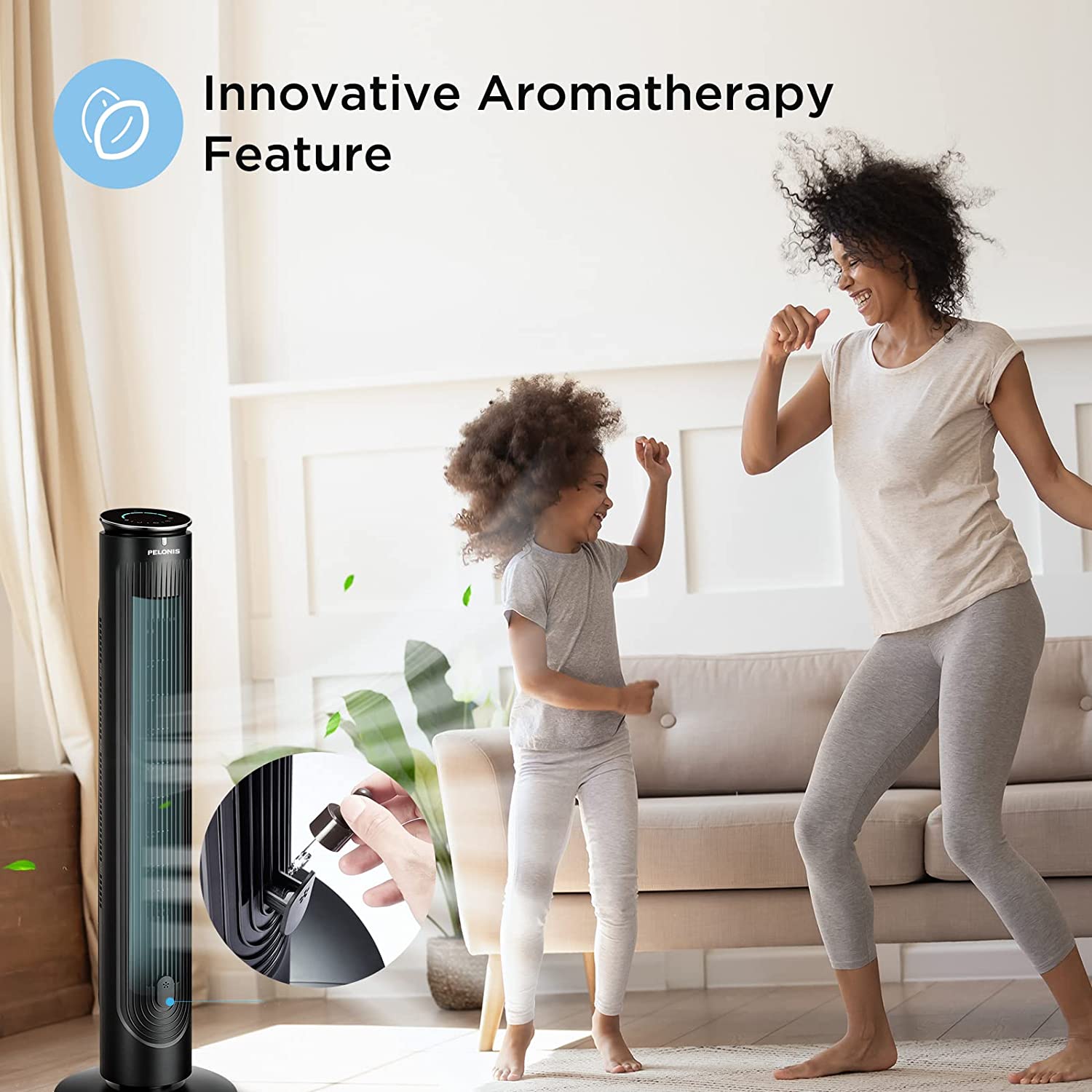 PELONIS 42'' Oscillating Tower Fan with Aromatherapy Diffuser. Remote Control. Black