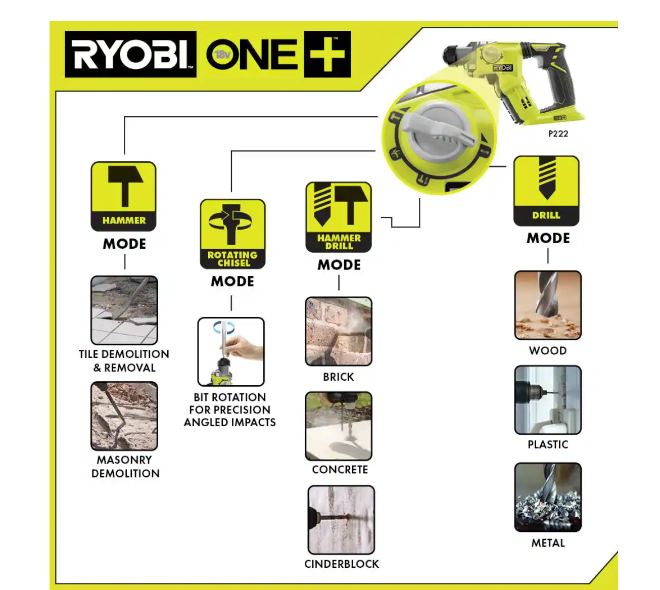 RYOBI P222-PSK005 ONE+ 18V Cordless 1/2 in. SDS-Plus Rotary Hammer Drill with 2.0 Ah Battery and Charger