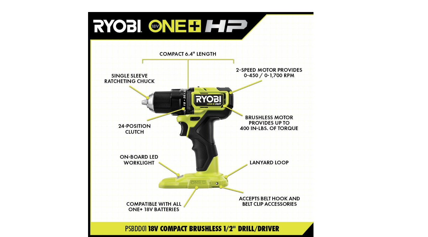 RYOBI PSBDD01K-PSBRS01B-PSBIW01B ONE+ HP 18V Brushless Cordless Compact 1/2 in. Drill/Driver. One-Handed Reciprocating Saw. Impact Wrench. (2) Batteries. Charger