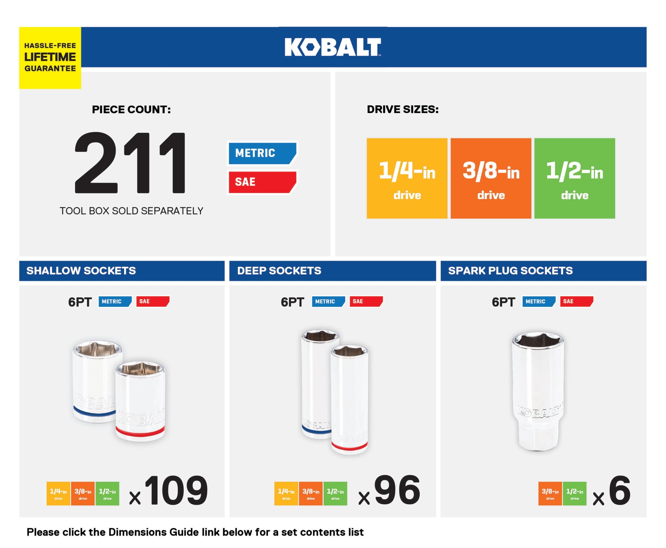 Kobalt 211-Piece Standard (SAE) and Metric 1/4-in to 1/2-in Drive 6-point Set Shallow/Deep Socket Set