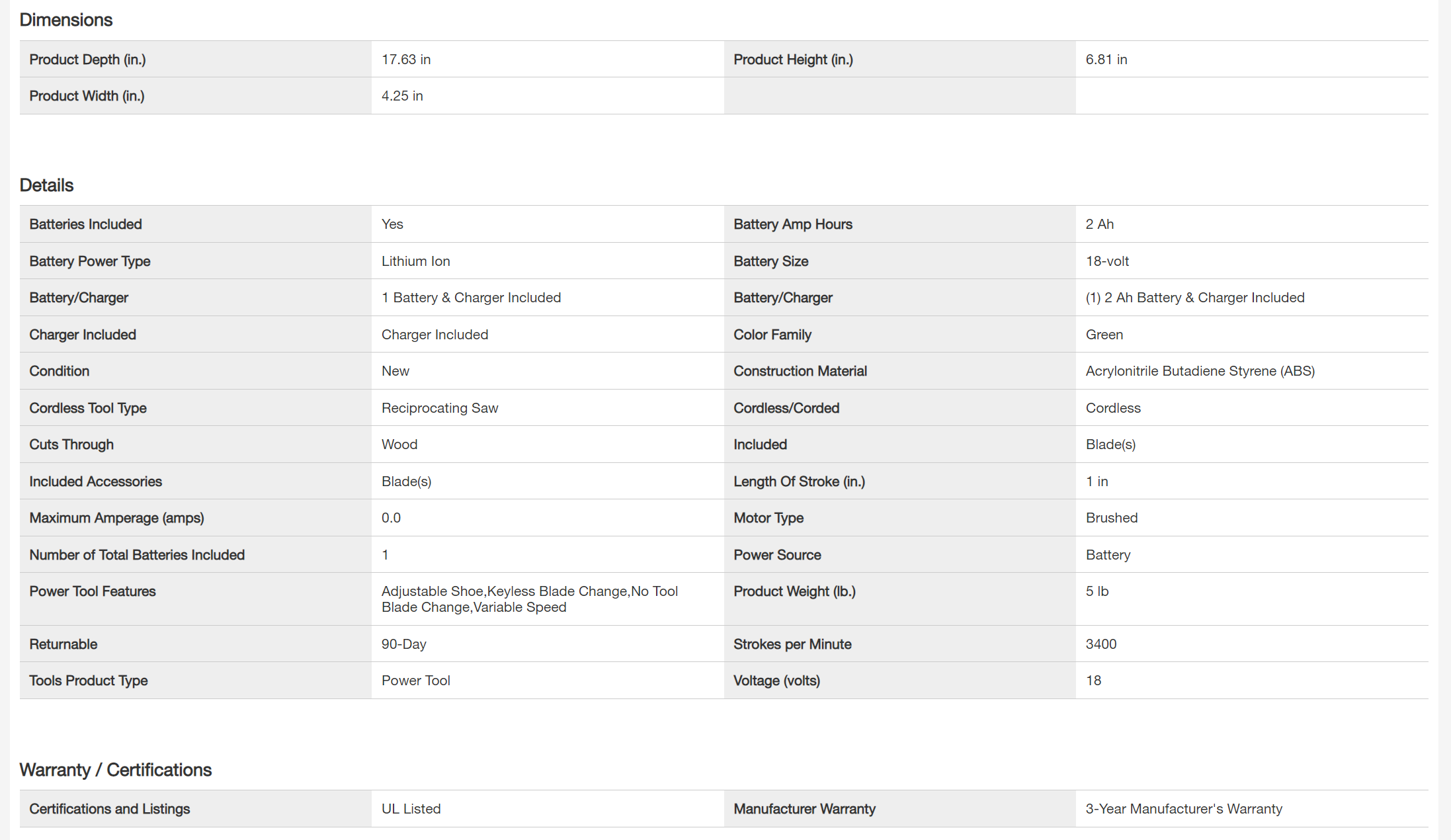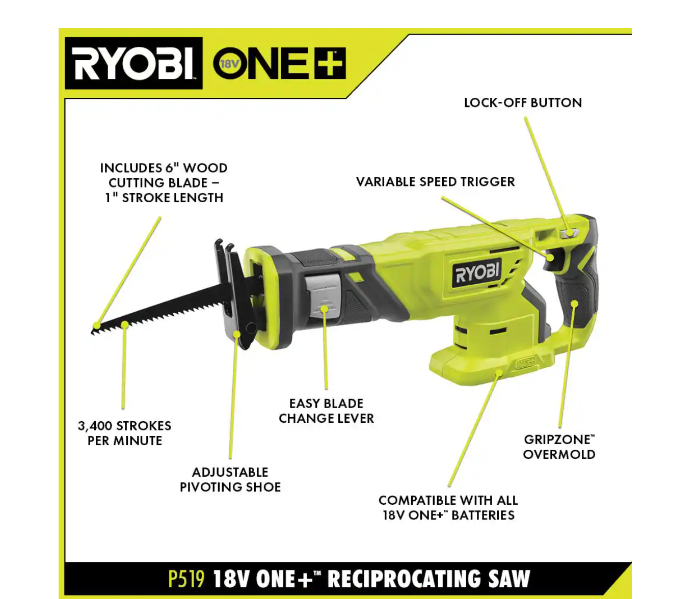 RYOBI P519-PSK005 ONE+ 18V Cordless Reciprocating Saw with 2.0 Ah Battery and Charger