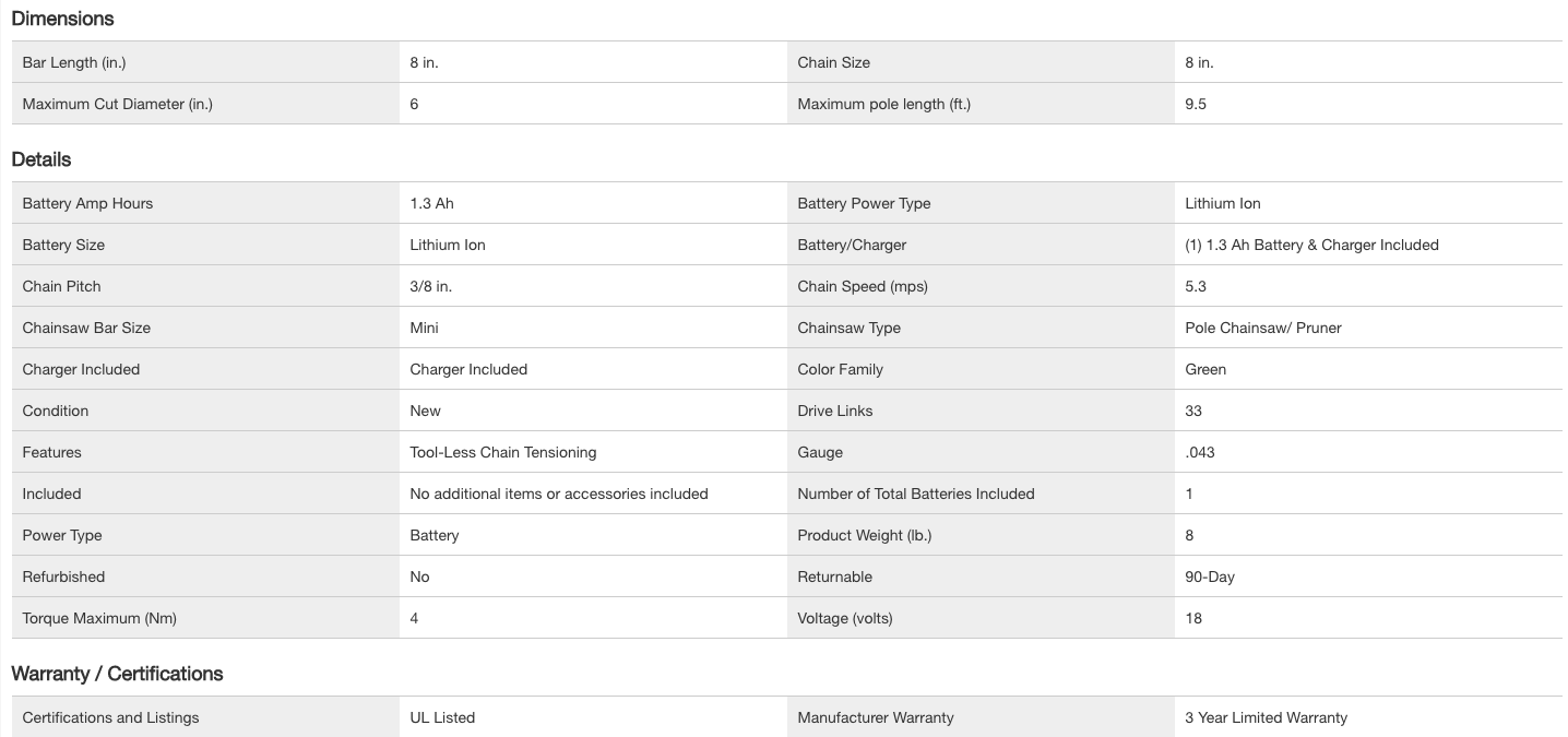 RYOBI P4361 ONE+ 18V 8 in. Cordless Battery Pole Saw with 1.3 Ah Battery and Charger