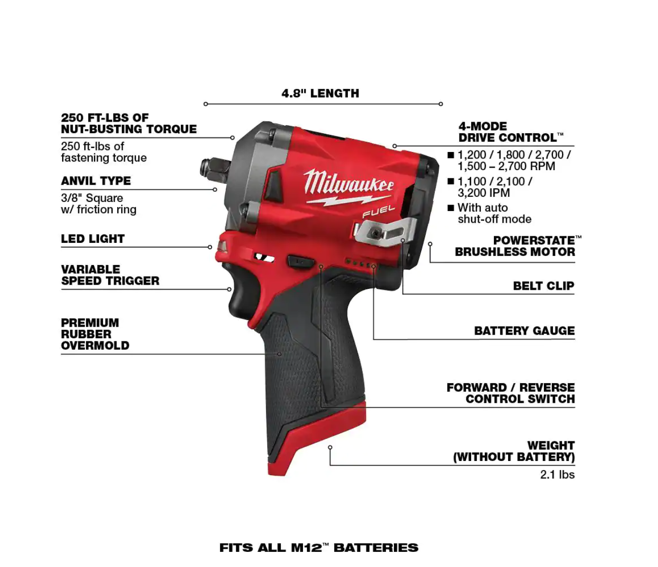 Milwaukee 2555-22-0852-20 M12 FUEL 12V Lithium-Ion Brushless Cordless Stubby 1/2 in. Impact Wrench Kit with Compact Spot Blower