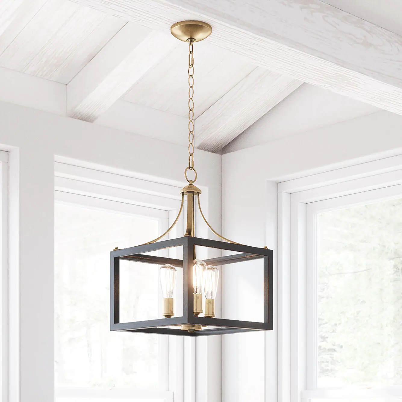Top Rated Hampton Bay Boswell Quarter 14 in. 3-Light Vintage Brass Farmhouse Square Chandelier with Painted Black Distressed Wood Accents