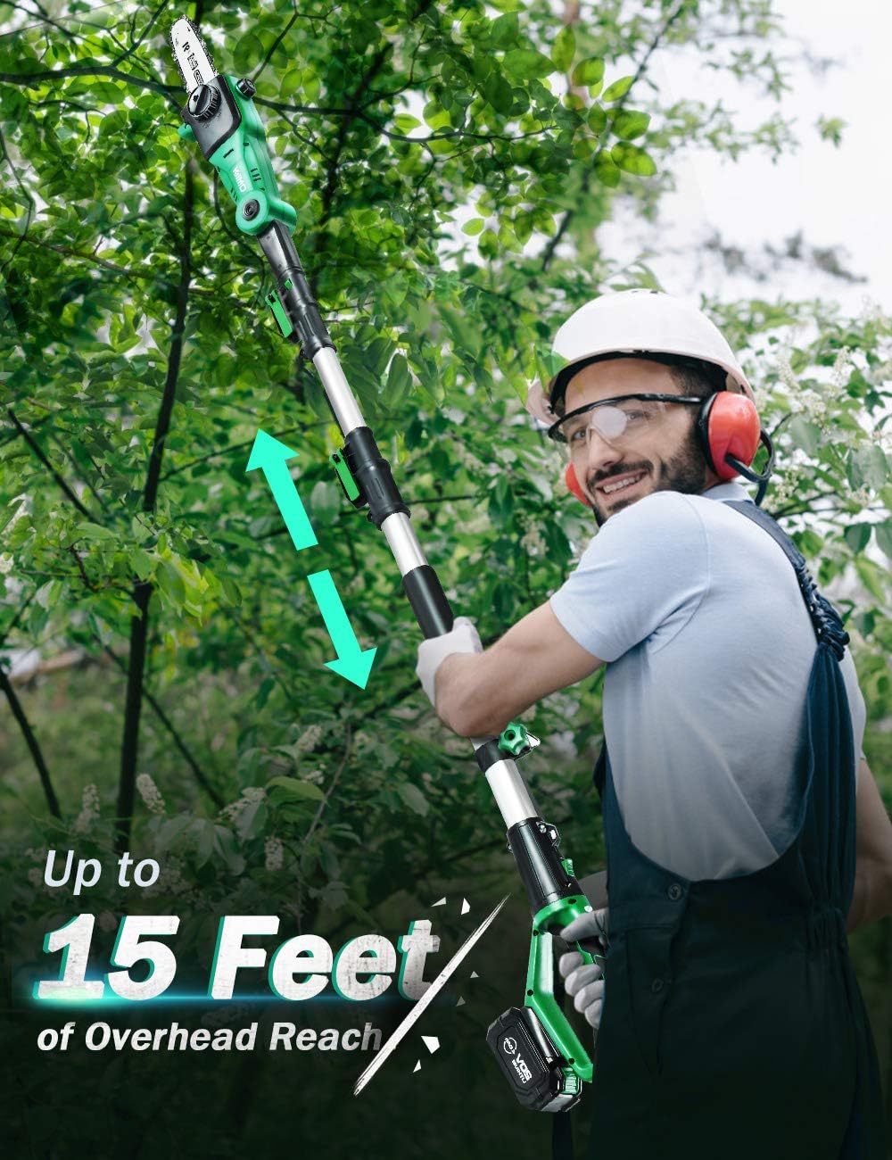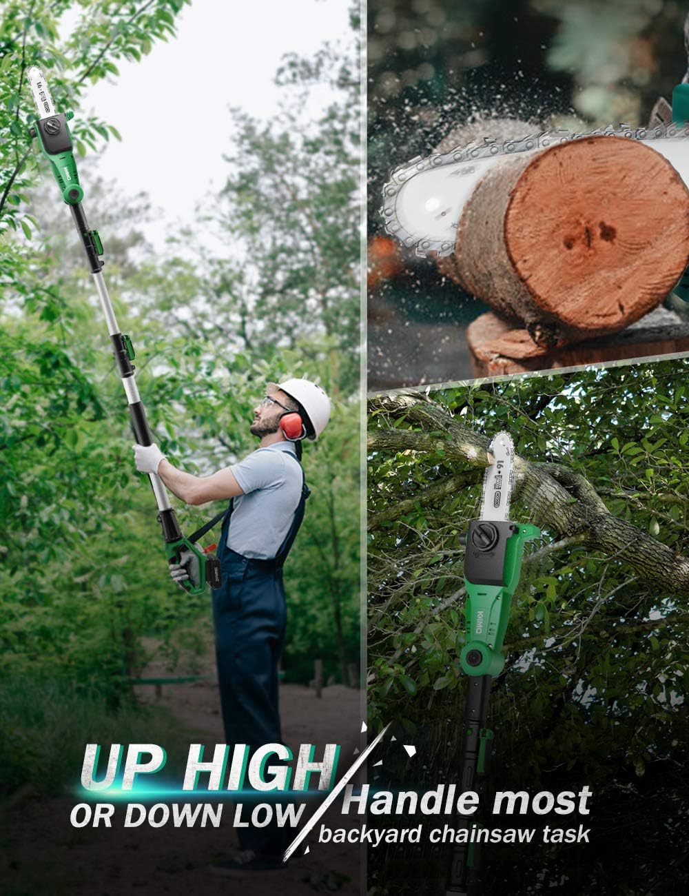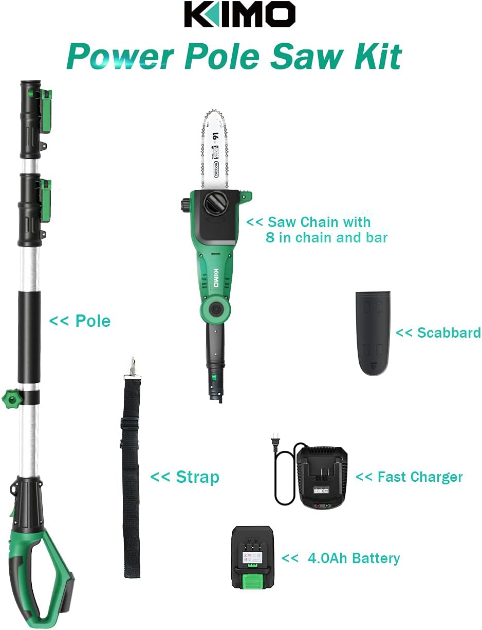 KIMO Pole Saw. 13-Foot Max. Reach 4000mAh Battery Powered Pole Saw for Tree Trimming. 8-Inch Cutting Bar. 18ft/s Speed. Auto Oiling. Multi-Angle Electric Pole Chain Saw Cordless with Telescoping Pole