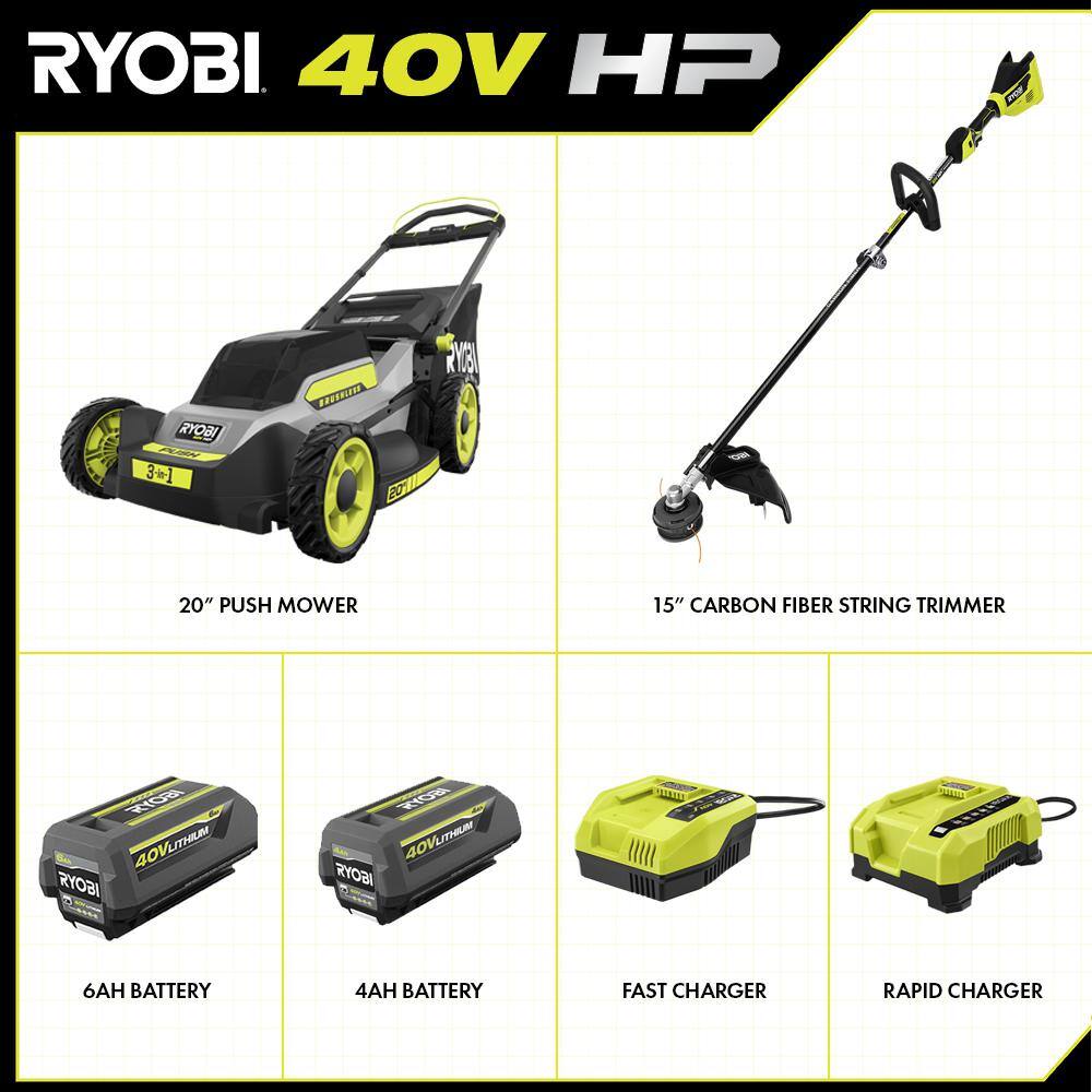 RYOBI RY401170-4X 40V HP Brushless 20 in. Cordless Battery Walk Behind Push Mower & String Trimmer with (2) Batteries and Chargers