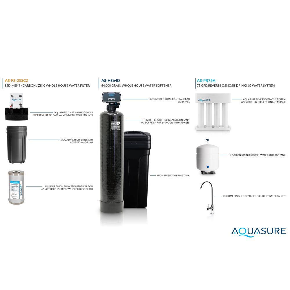 AQUASURE 1004804745 Whole House Filtration with 64.000 Grain Water Softener. Reverse Osmosis System and Sediment-GAC Pre-filter