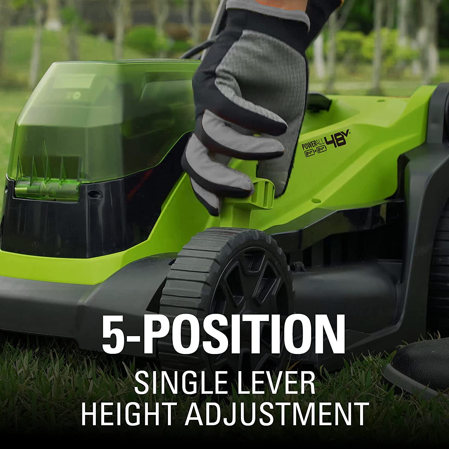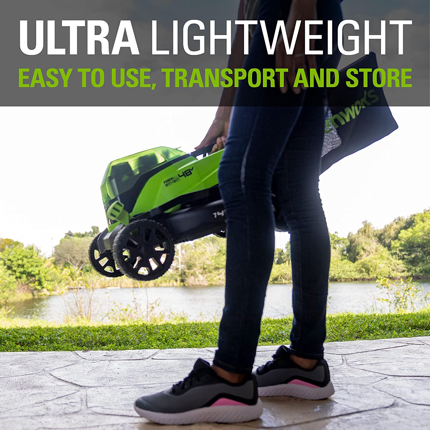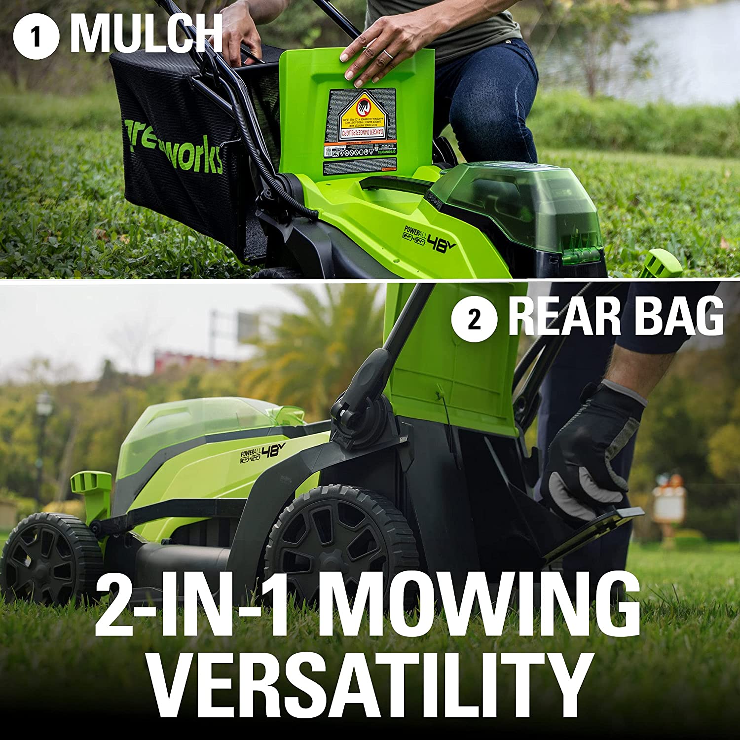 Greenworks 2 x 24V (48V) 14″ Brushless Cordless Lawn Mower. (2) 4.0Ah USB Batteries (USB Hub) and Dual Port Rapid Charger Included