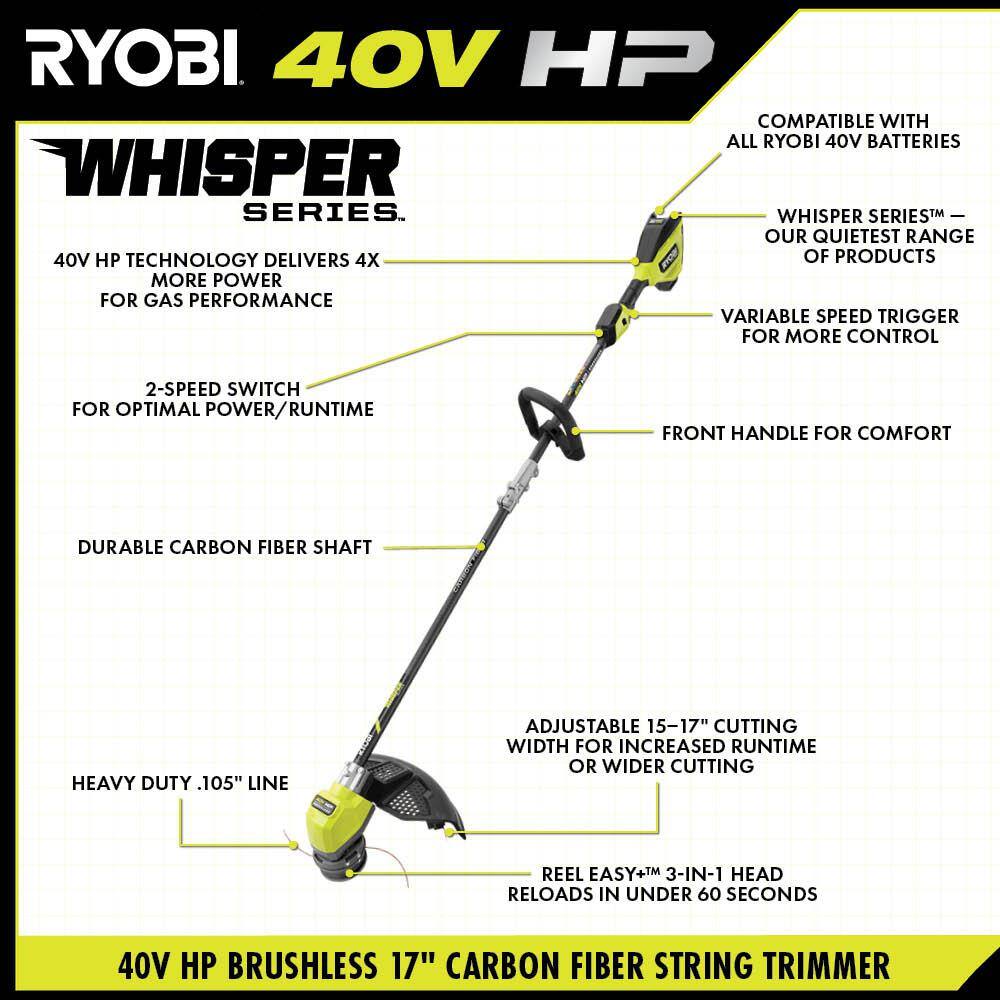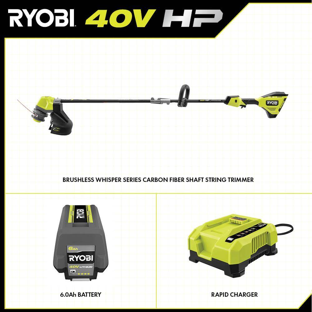RYOBI RY402110VNM 40V HP Brushless Whisper Series 17 in. Cordless Battery Carbon Fiber Shaft String Trimmer w/ 6.0 Ah Battery & Charger