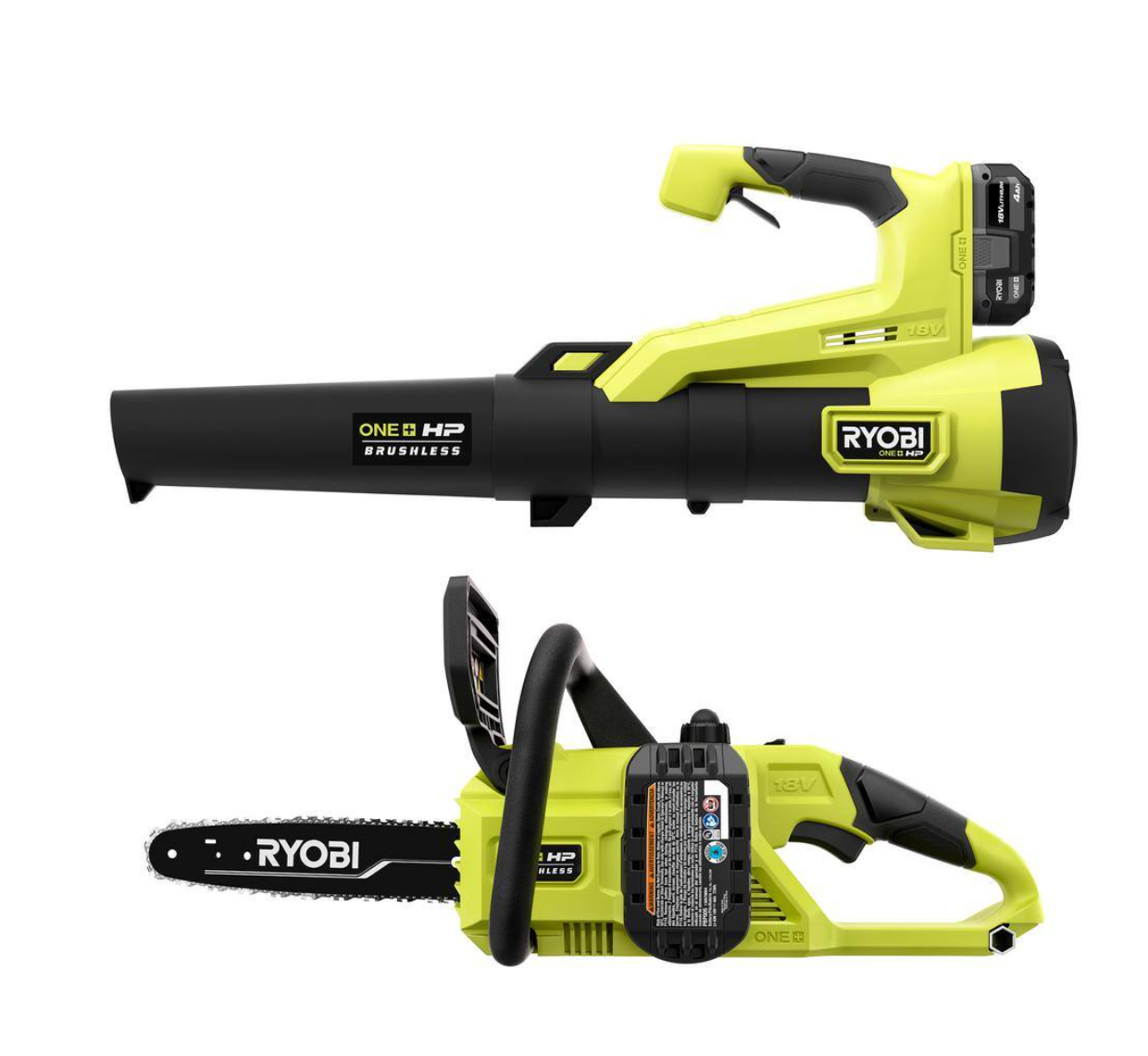 RYOBI P2520-BLW ONE+ HP 18V Brushless 10 in. Cordless Battery Chainsaw and 110 MPH 350 CFM Leaf Blower with 4.0 Ah Battery and Charger