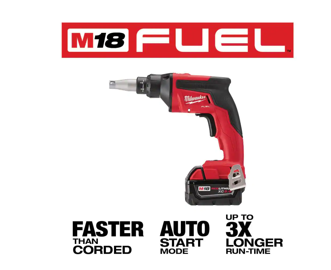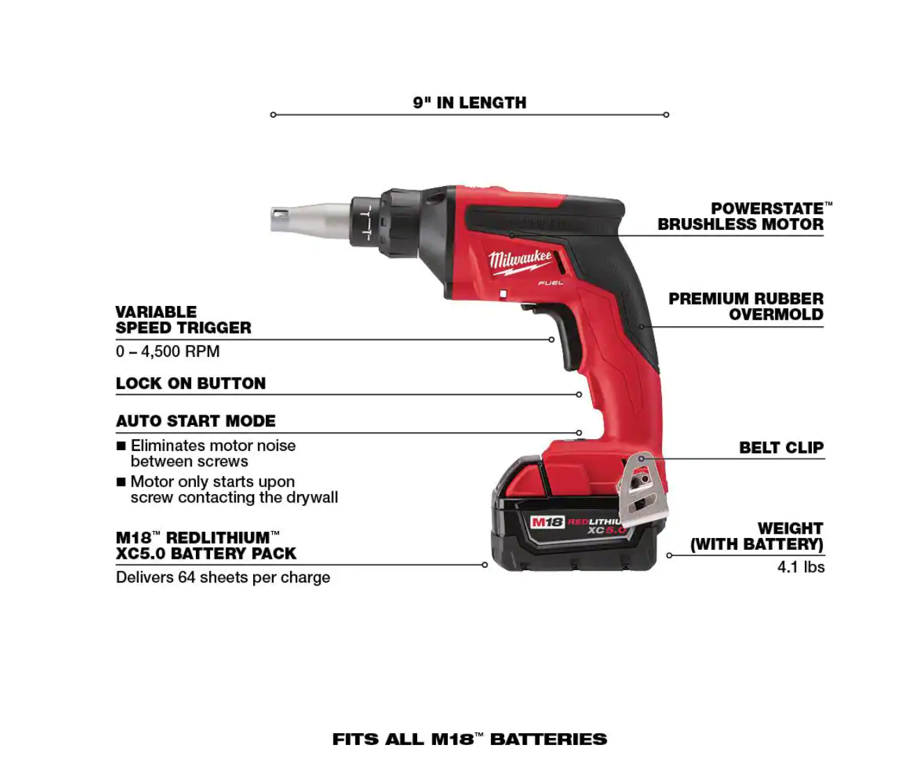 Milwaukee 2866-20-48-59-1850 M18 FUEL 18-Volt Lithium-Ion Brushless Cordless Drywall Screw Gun and Starter Kit with (1) 5.0 Ah Battery and Charger