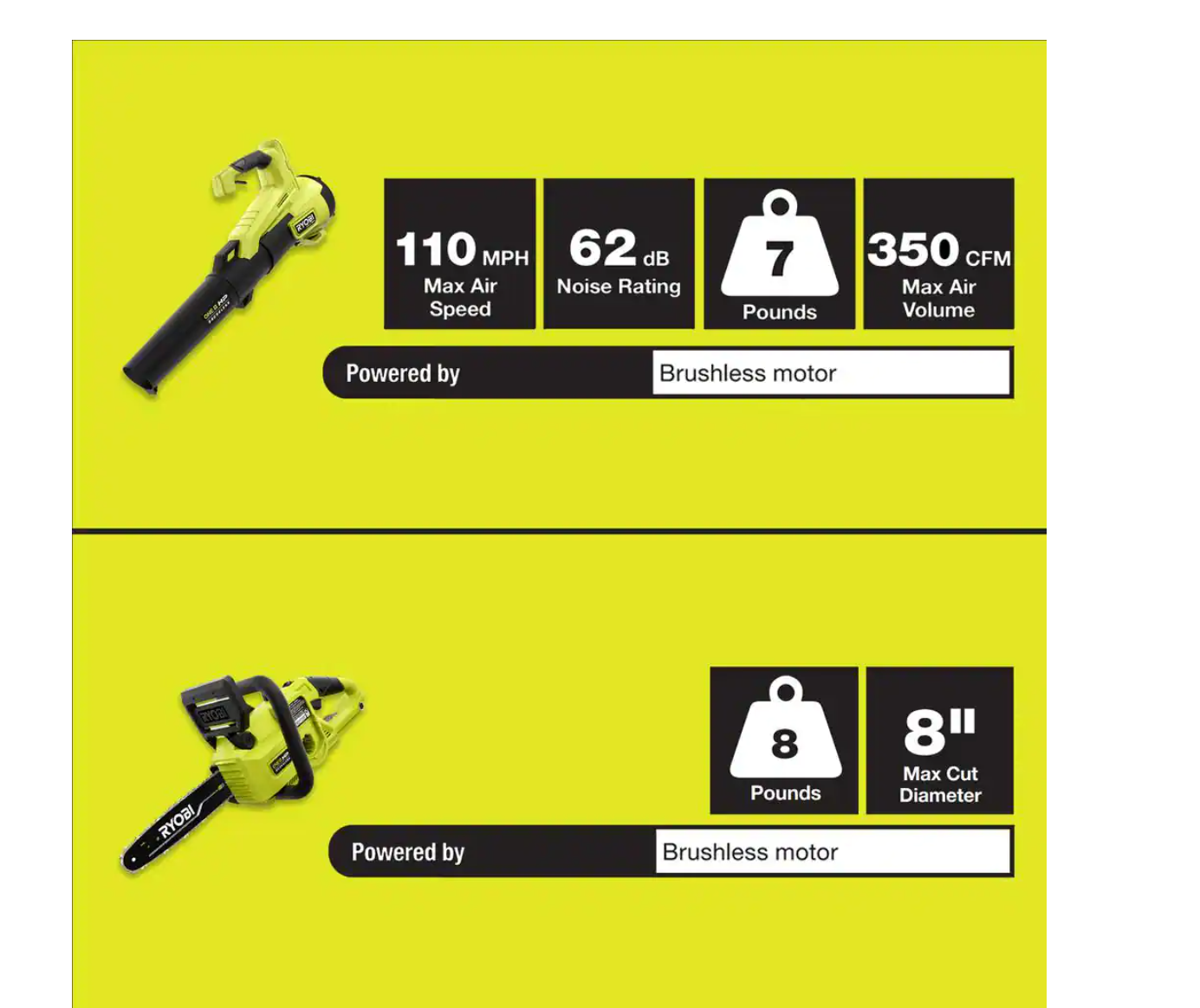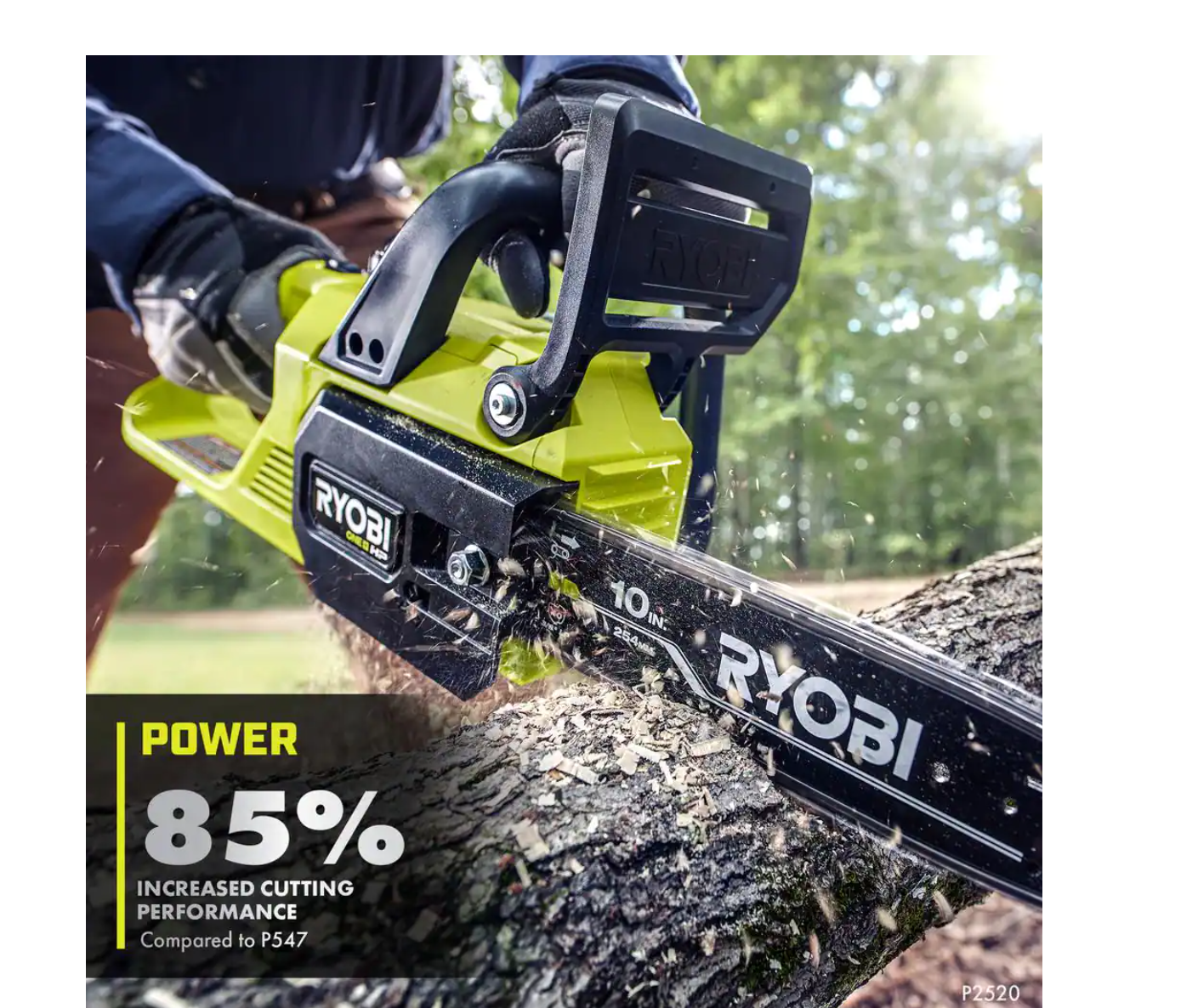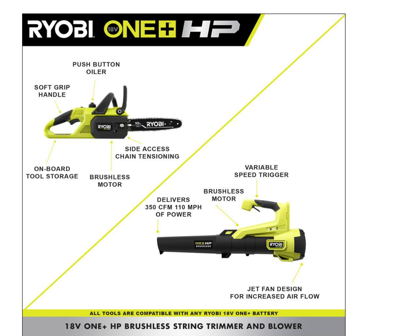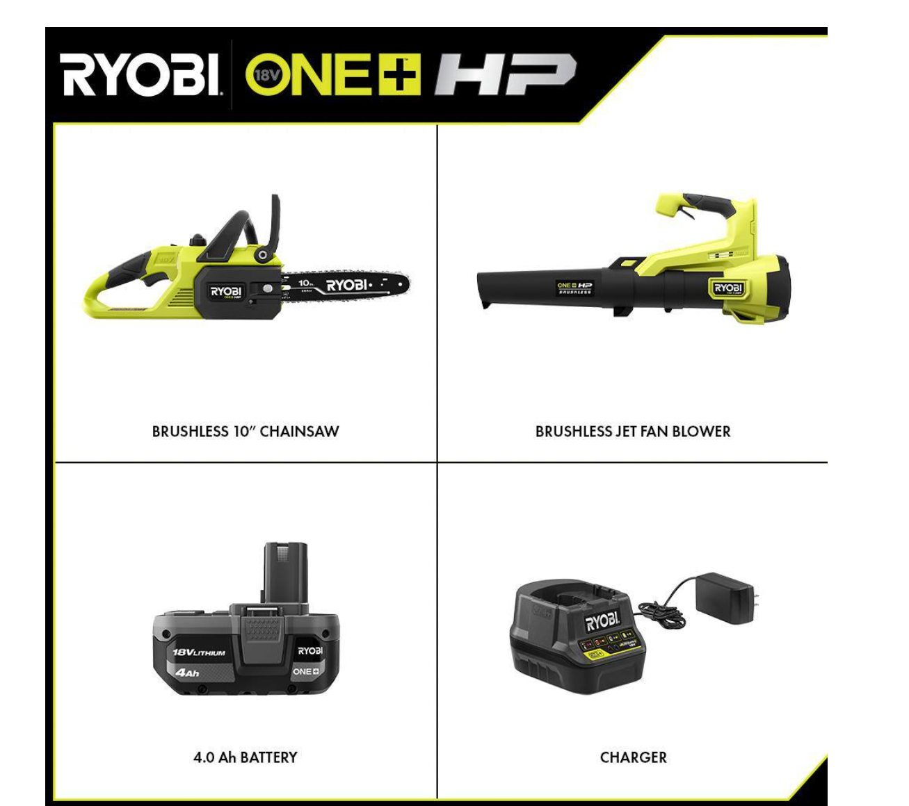 RYOBI P2520-BLW ONE+ HP 18V Brushless 10 in. Cordless Battery Chainsaw and 110 MPH 350 CFM Leaf Blower with 4.0 Ah Battery and Charger