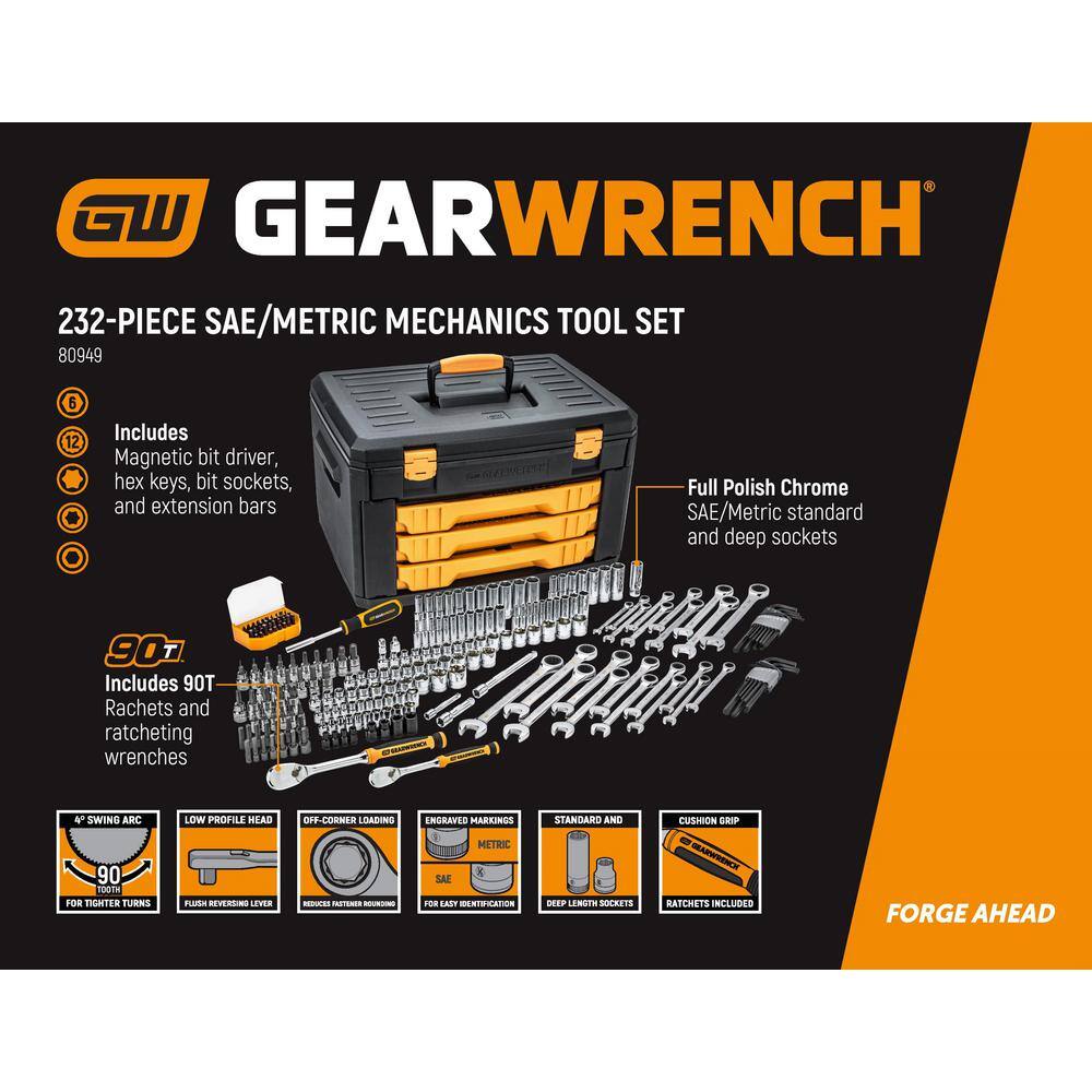 GEARWRENCH 80949 1/4 in. and 3/8 in. Drive 90-Tooth Standard and Deep SAE/Metric Mechanics Tool Set in 3-Drawer Storage Box (232-Piece)