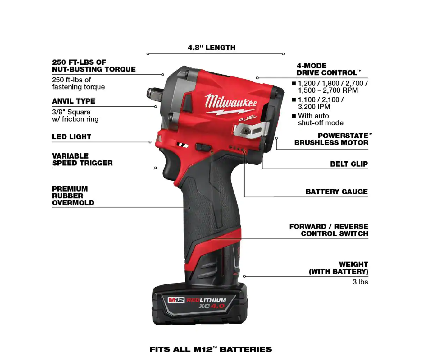 Milwaukee 2554-22 M12 FUEL 12V Lithium-Ion Brushless Cordless Stubby 3/8 in. Impact Wrench Kit with One 4.0 and One 2.0Ah Batteries