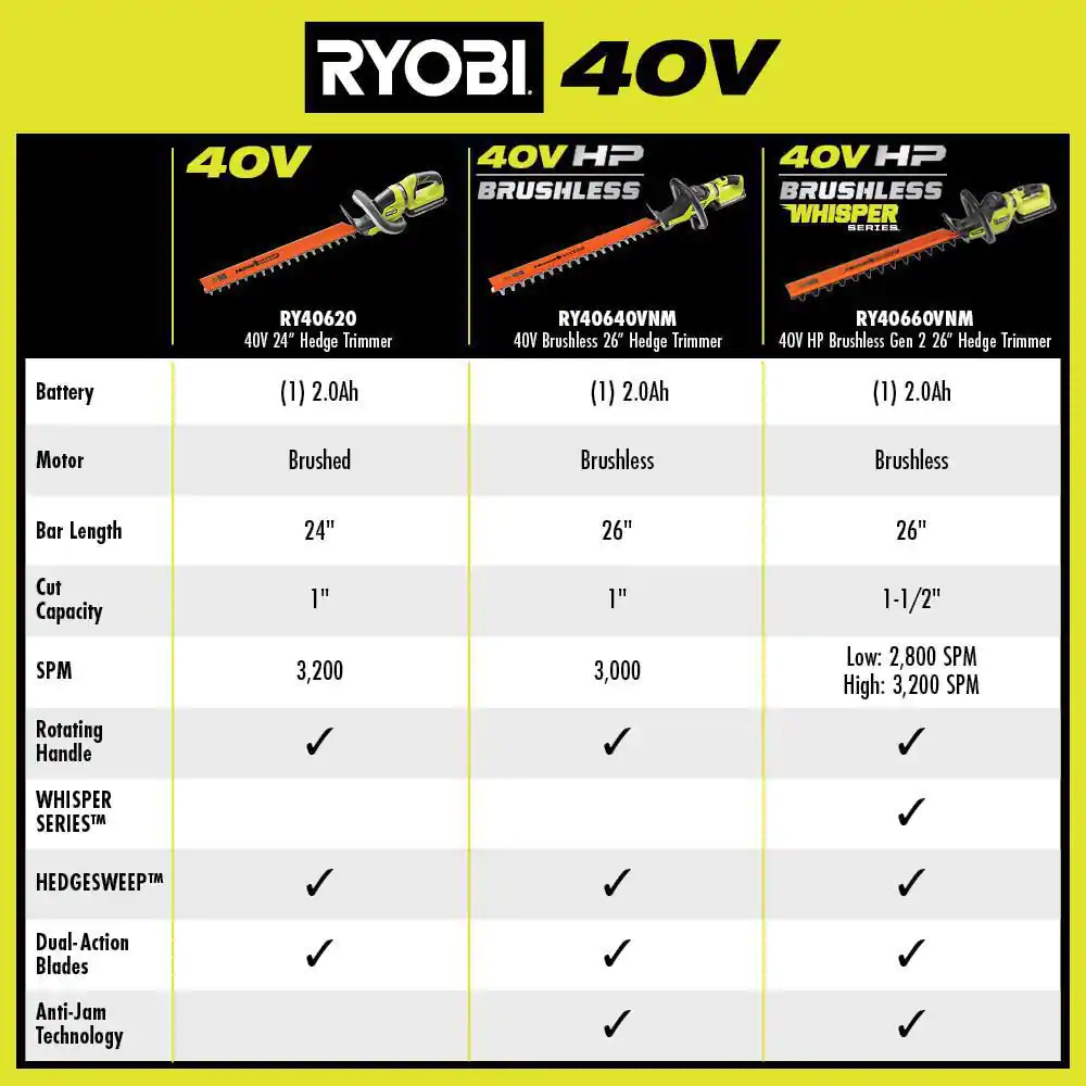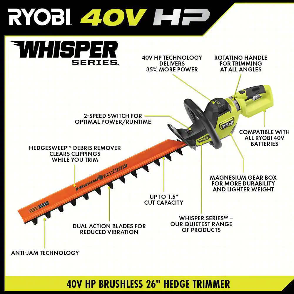 RYOBI RY40660VNM 40V HP Brushless Whisper Series 26 in. Cordless Battery Hedge Trimmer with 2.0 Ah Battery and Charger