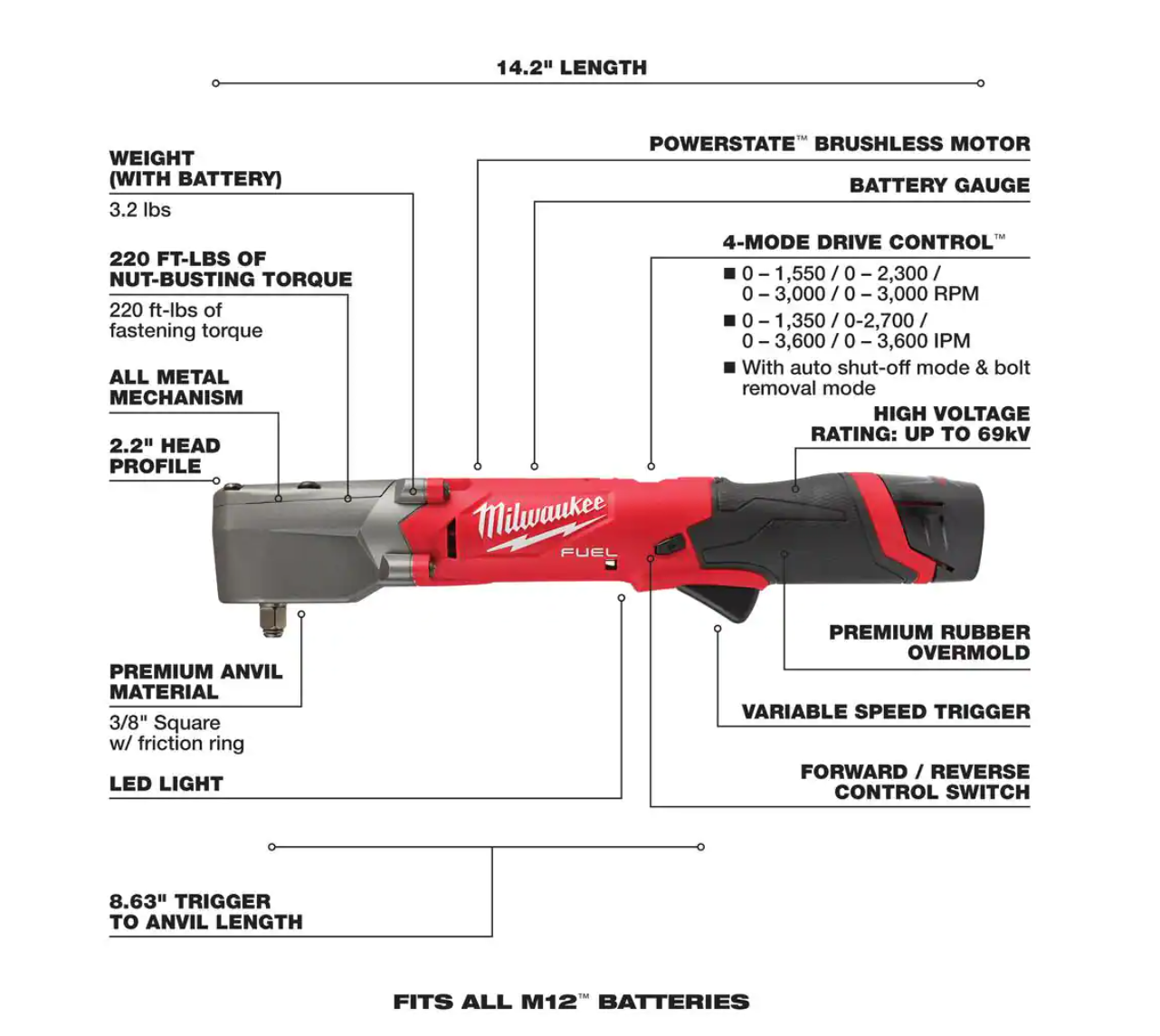 Milwaukee 2567-20-2522-20-2485-20 M12 FUEL 12V Lithium-Ion Brushless Cordless High Speed 3/8 in. Ratchet w/M12 FUEL 3 in. Cutoff Saw & 1/4 in. Die Grinder