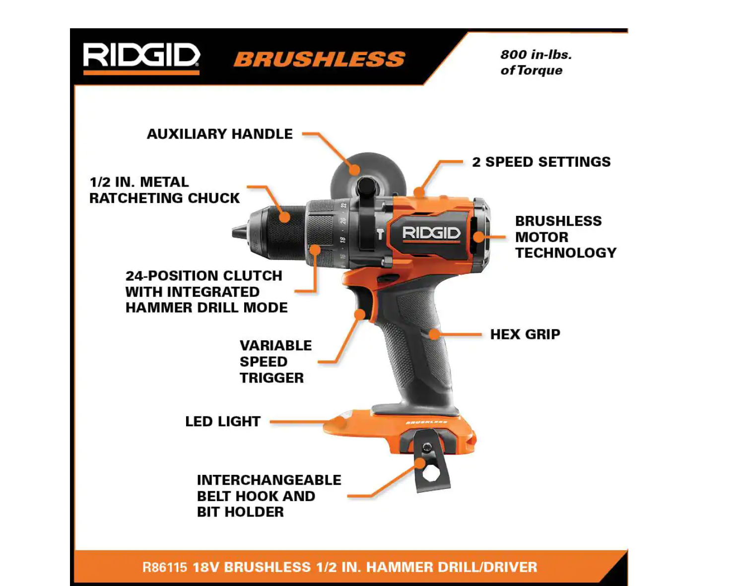 RIDGID R960261SBN 18V Brushless Cordless 1/2 in. Hammer Drill and Recip Saw Kit with (1) 4.0Ah Battery. (1) 2.0Ah Battery. Charger