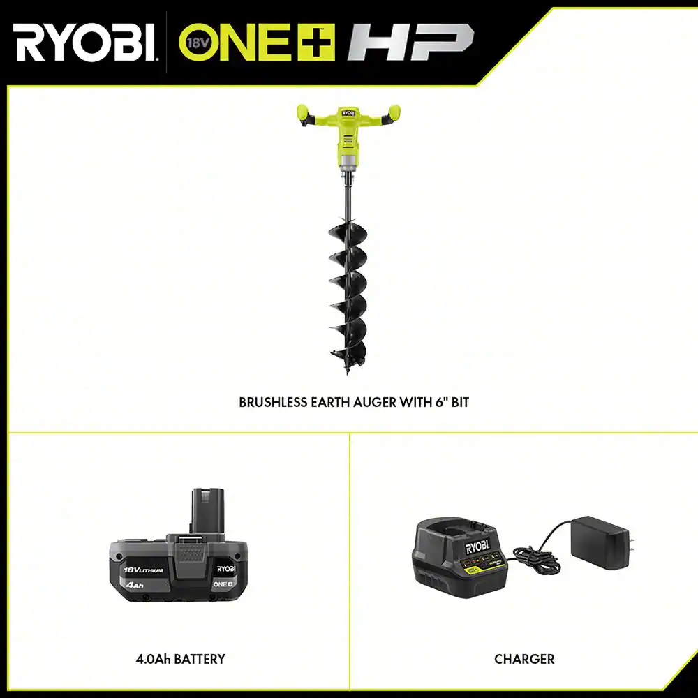 RYOBI P2930VNM ONE+ HP 18V Brushless Cordless Earth Auger with 6 in. Bit with 4.0 Ah Battery and Charger