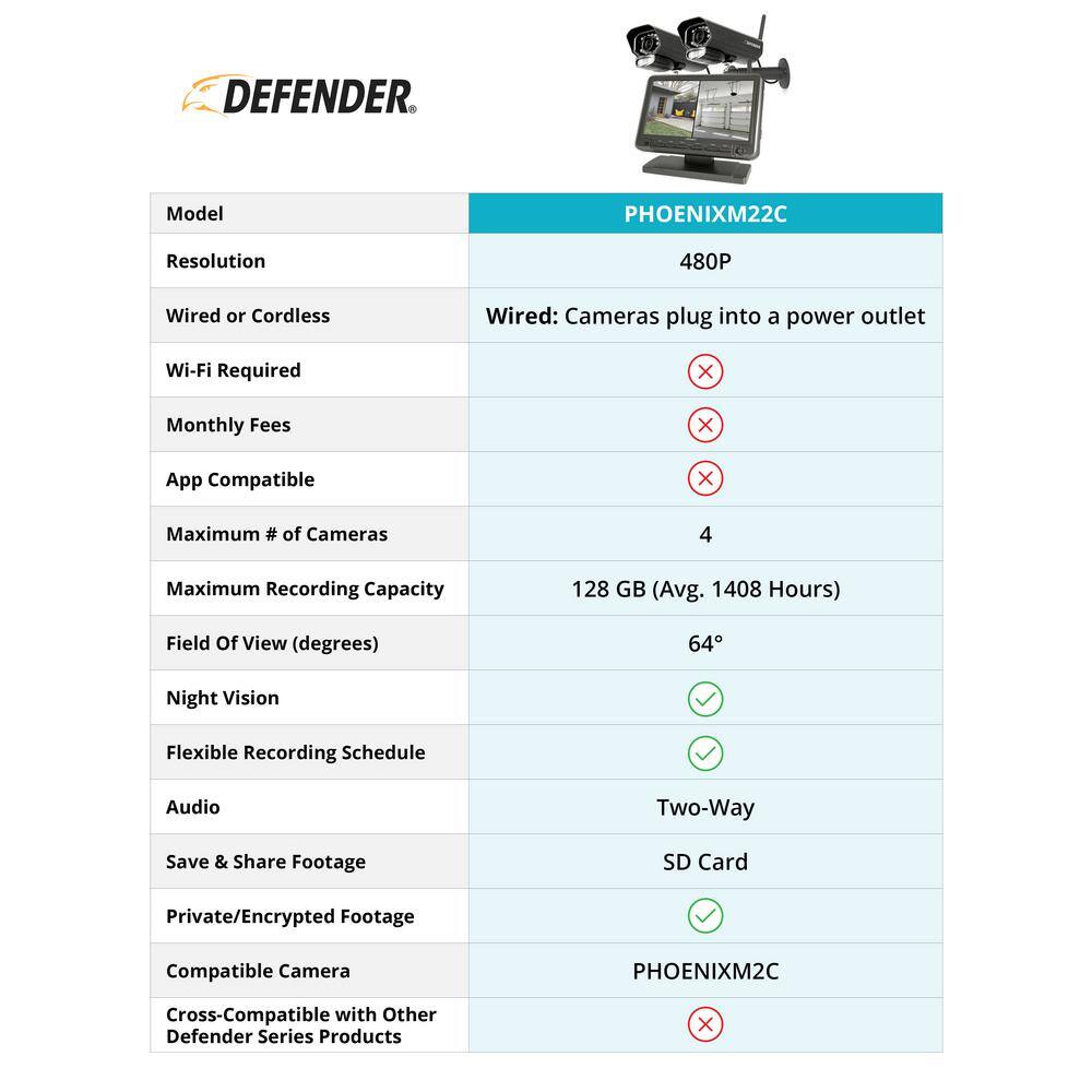 Defender PHOENIXM22C PHOENIXM2 Non-Wi-Fi. Plug-In Power Security Camera System with 7″ Monitor SD Card Recording and 2 Night Vision Cameras