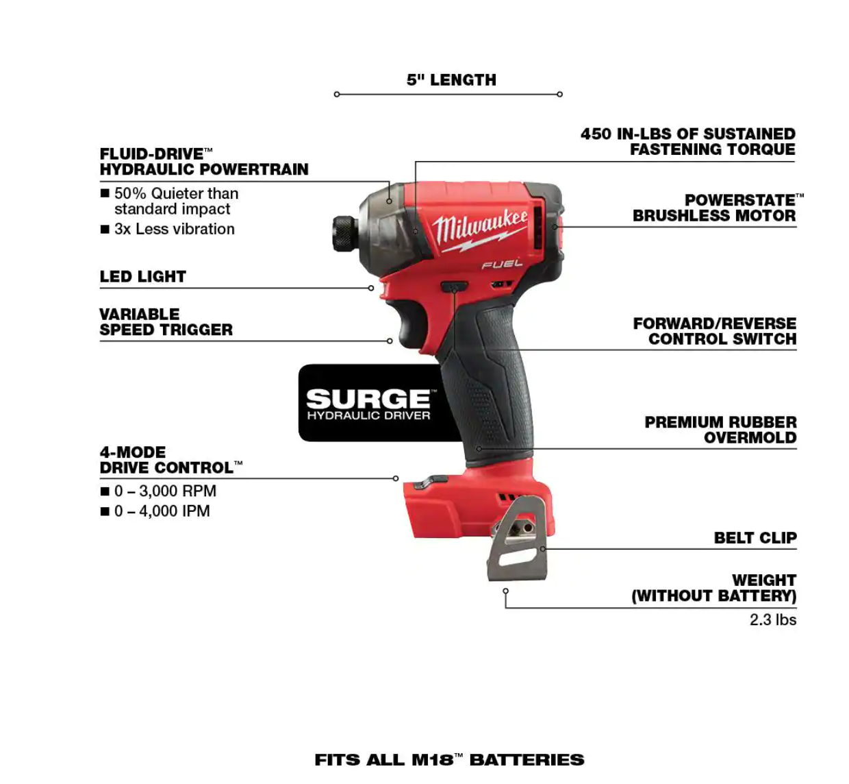 Milwaukee 2760-20-48-59-1835 M18 FUEL SURGE 18V Lithium-Ion Brushless Cordless 1/4 in. Hex Impact Driver with 3.0Ah Battery and Charger