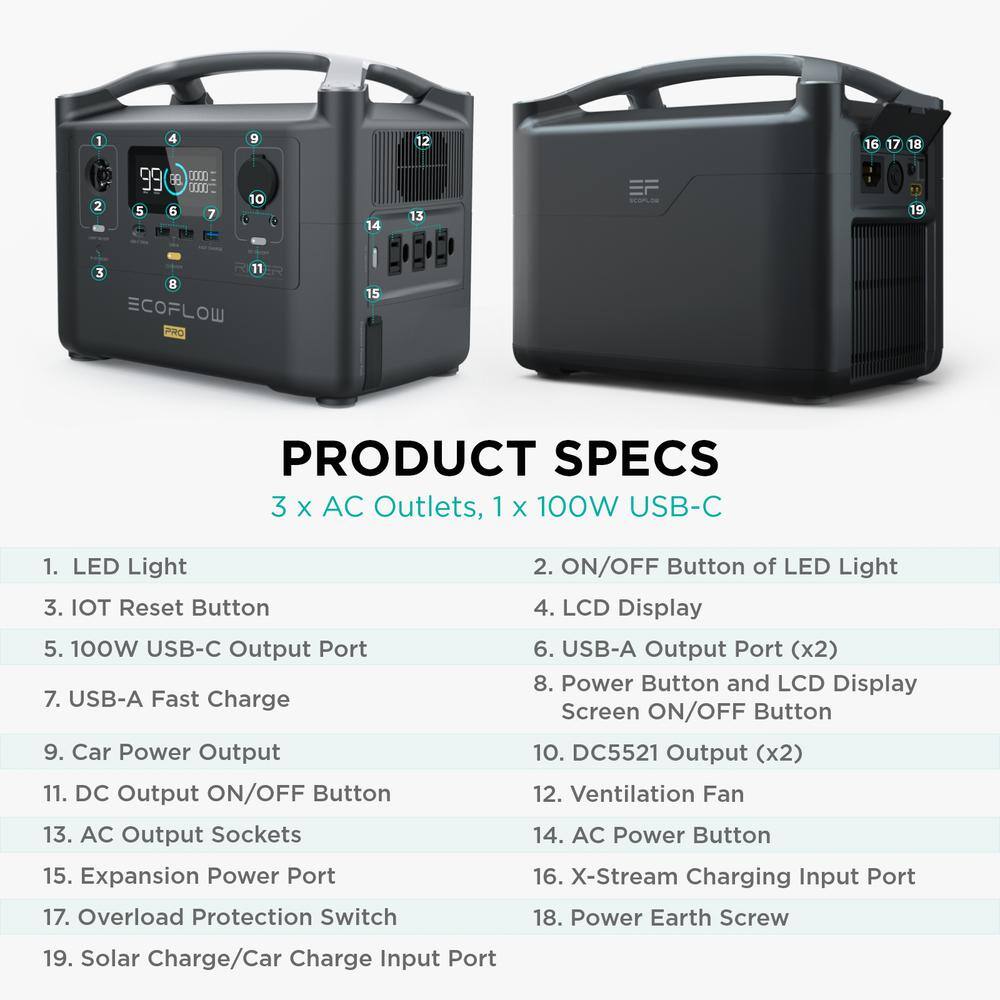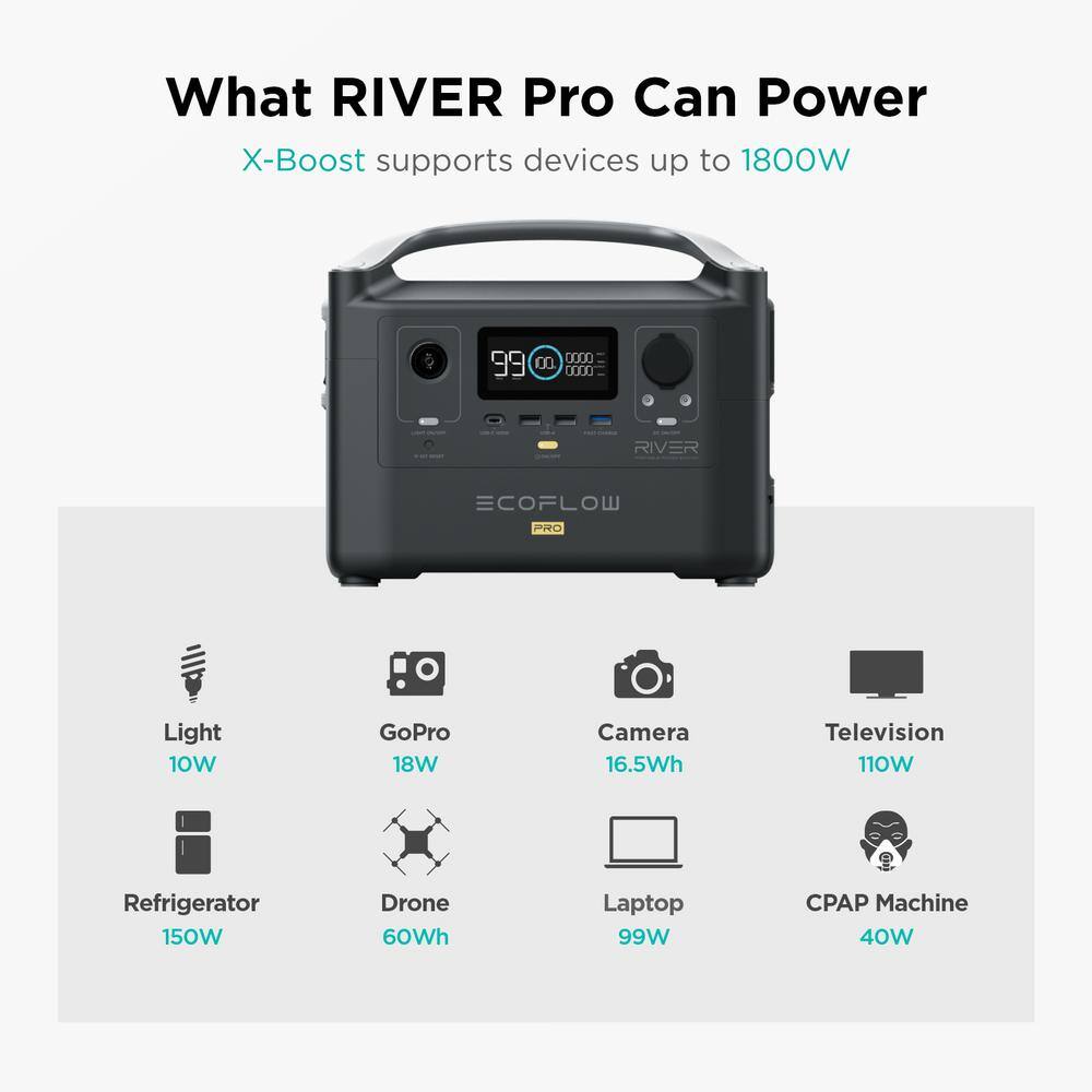 EcoFlow EFRIVER600PRO-AM 1200-Watt Peak Output River Pro Push Button Start Portable Battery Power Station. Solar Generator for Outdoors
