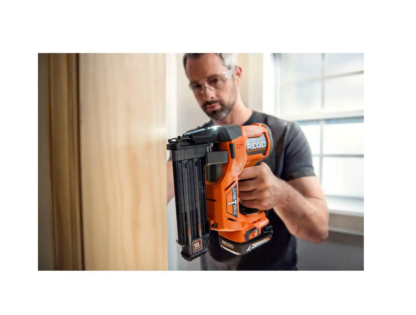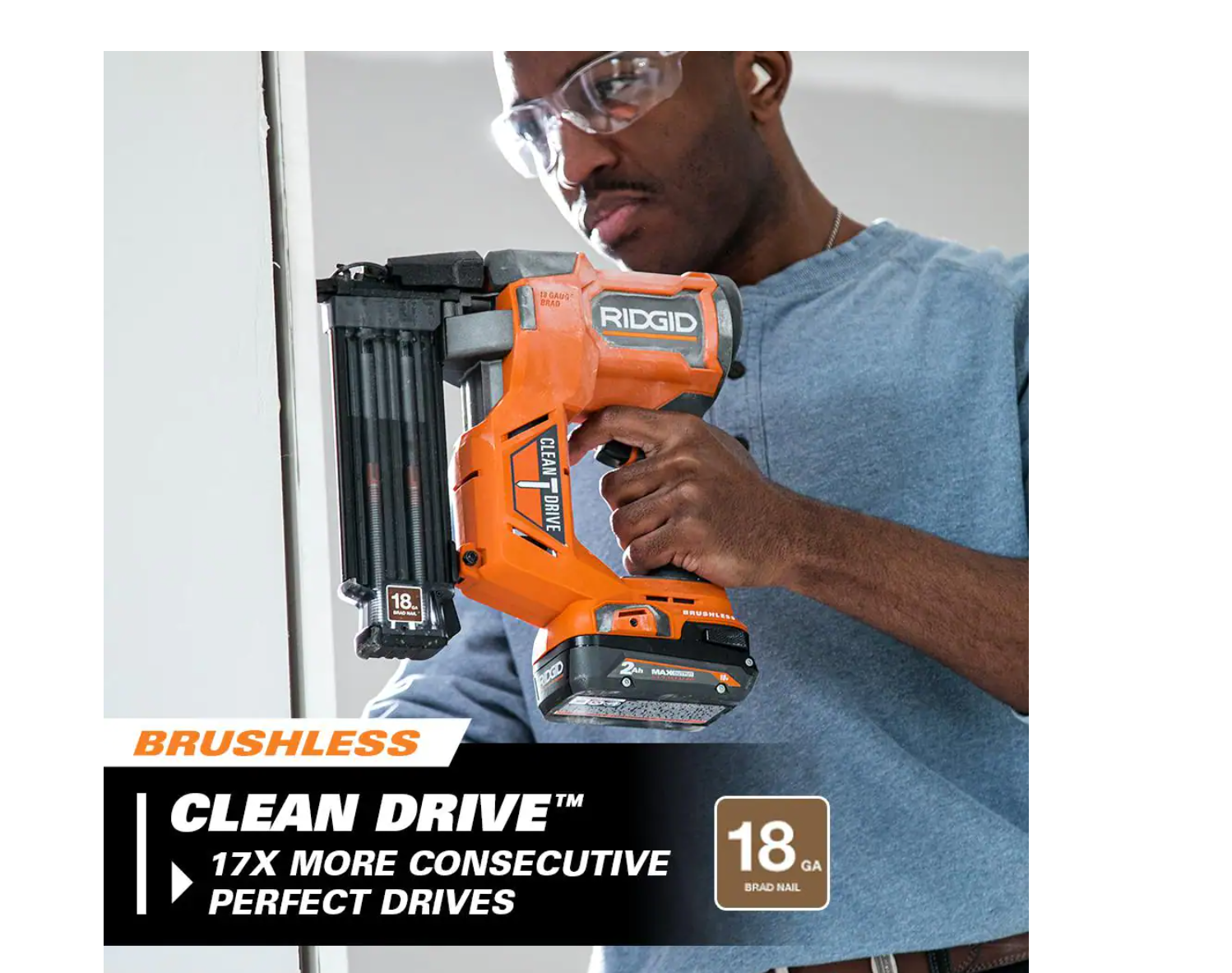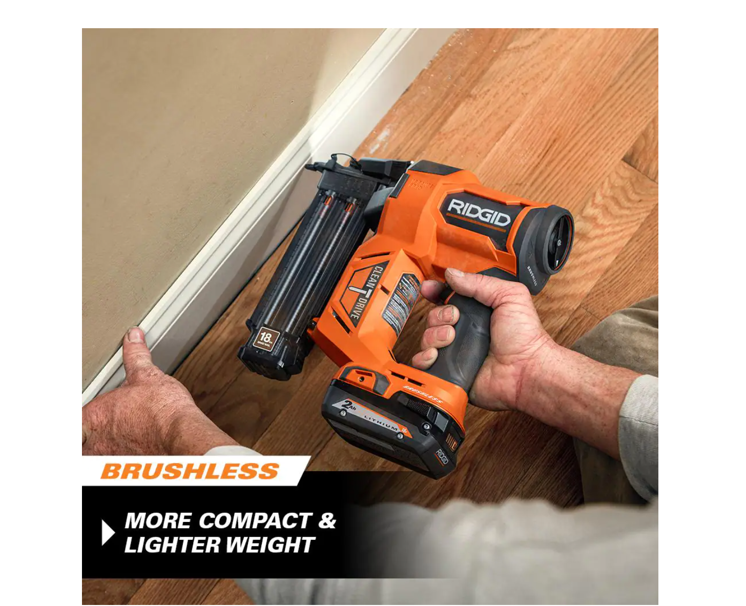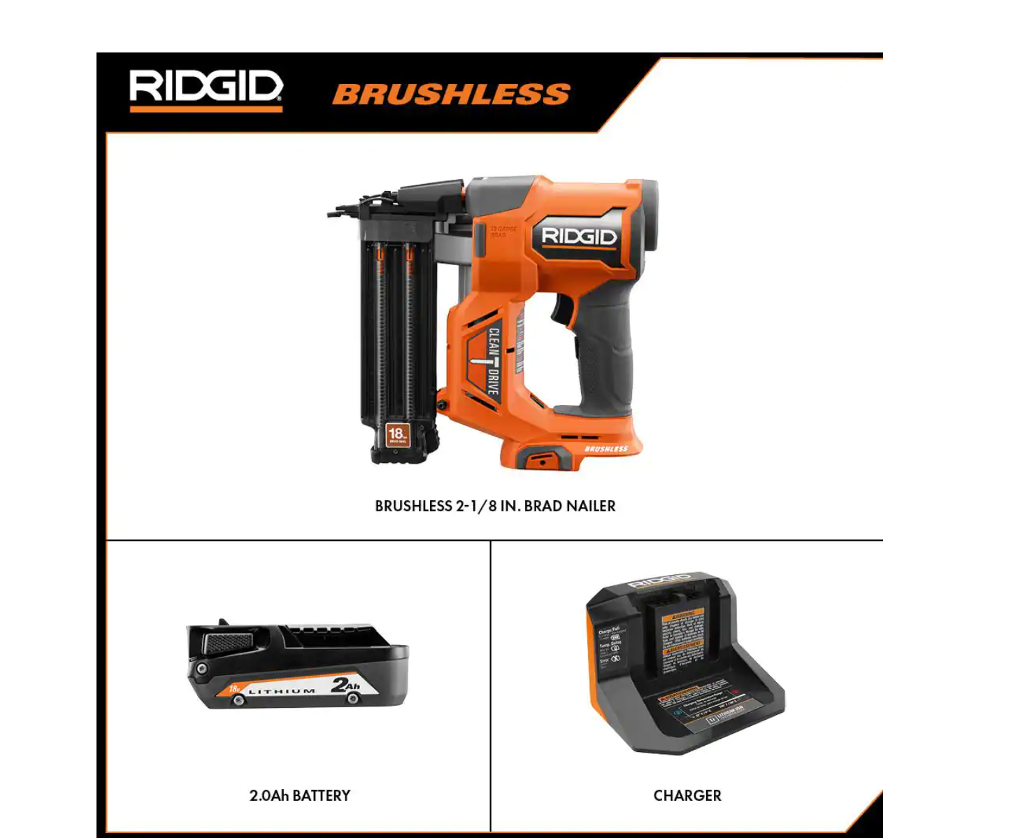 RIDGID R09891K 18V Brushless Cordless 18-Gauge 2-1/8 in. Brad Nailer with CLEAN DRIVE Technology with 2.0 Ah Battery and Charger