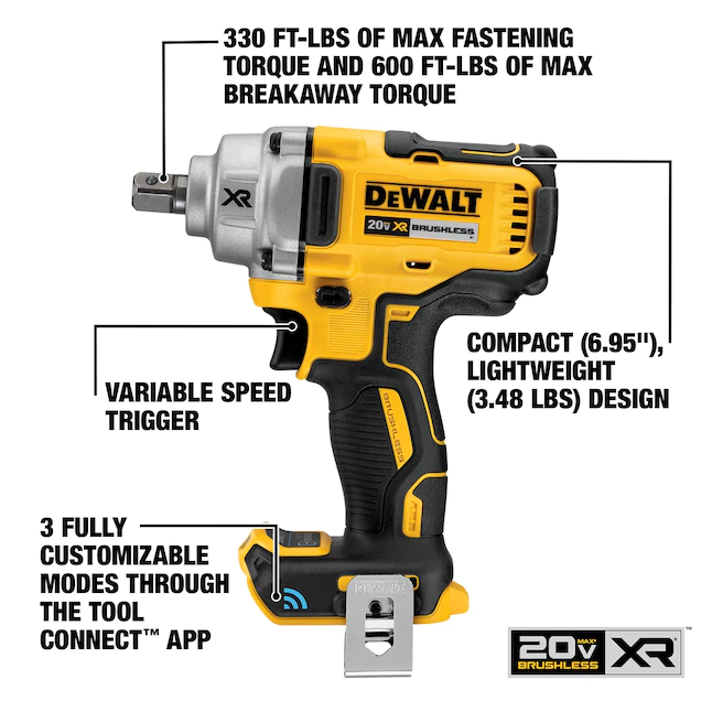 DEWALT DCF896B 20-Volt MAX XR Cordless Brushless 1/2 in. Mid-Range Impact Wrench with Detent Pin Anvil & Tool Connect (Tool-Only)