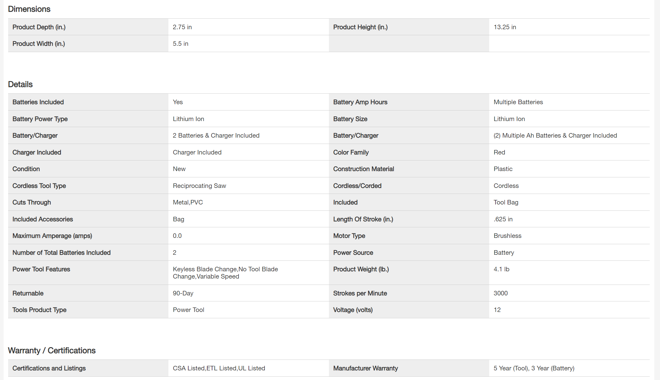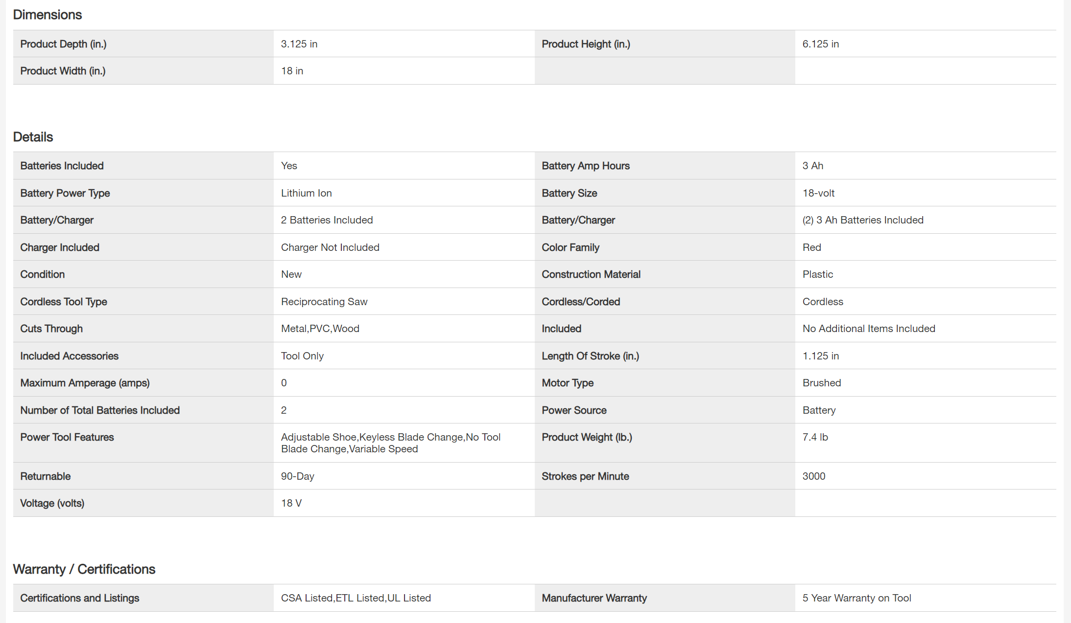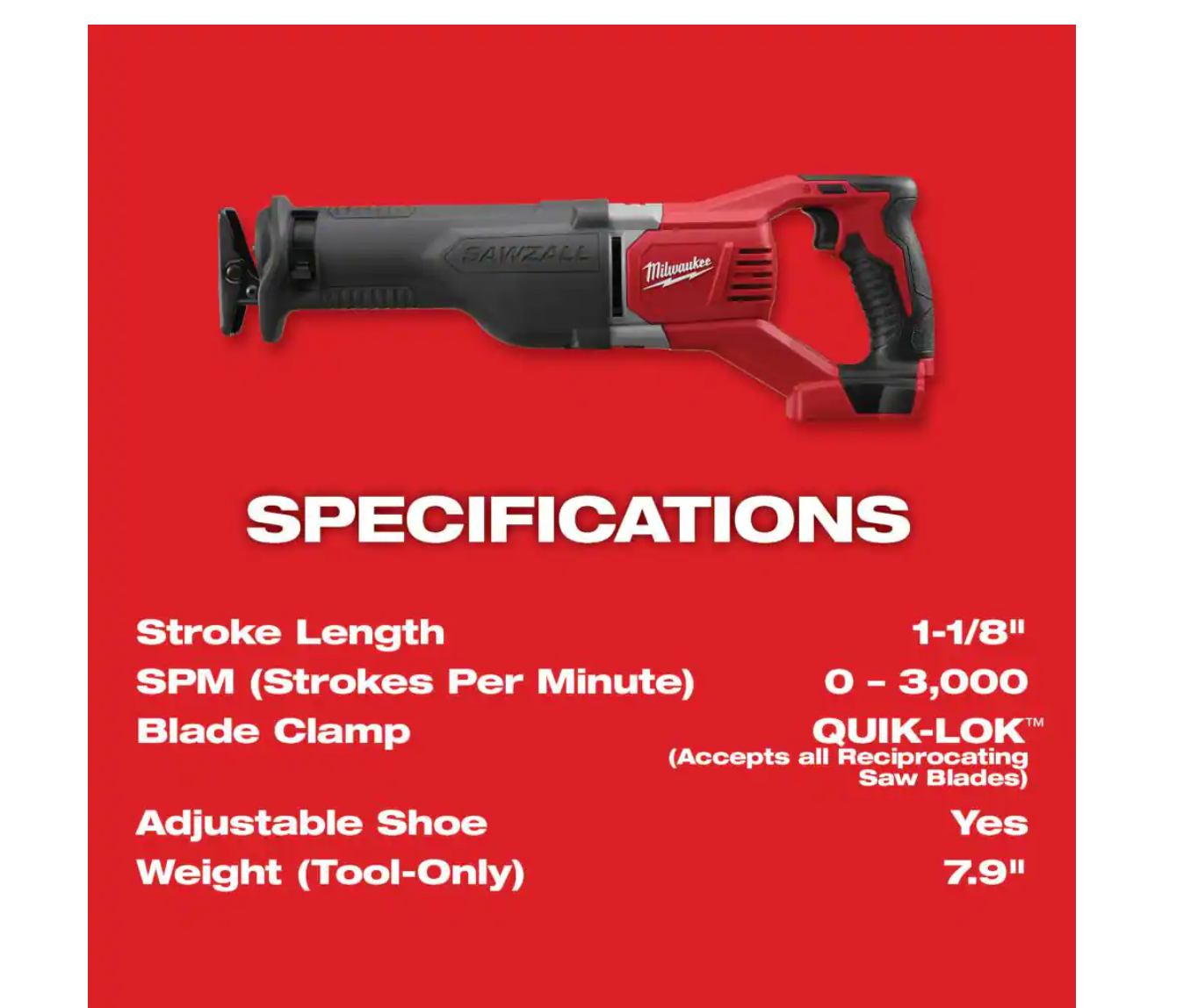 Milwaukee 2621-20-48-11-1837 M18 18V Lithium-Ion Cordless SAWZALL Reciprocating Saw with Two 3.0Ah Batteries
