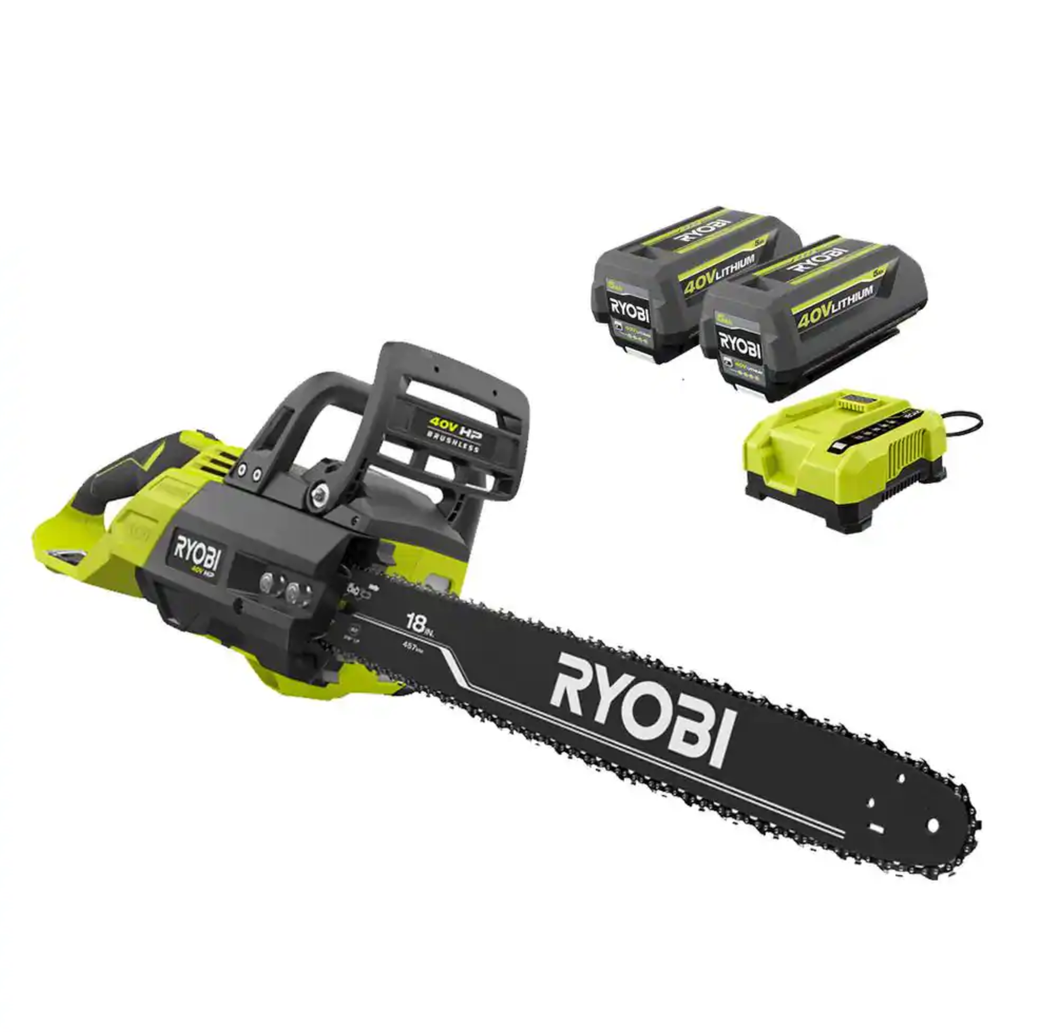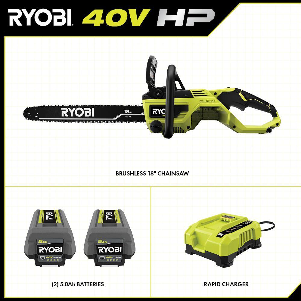 RYOBI RY40580-2B 40V HP Brushless 18 in. Electric Battery Chainsaw with (2) 5 Ah. Batteries and Charger