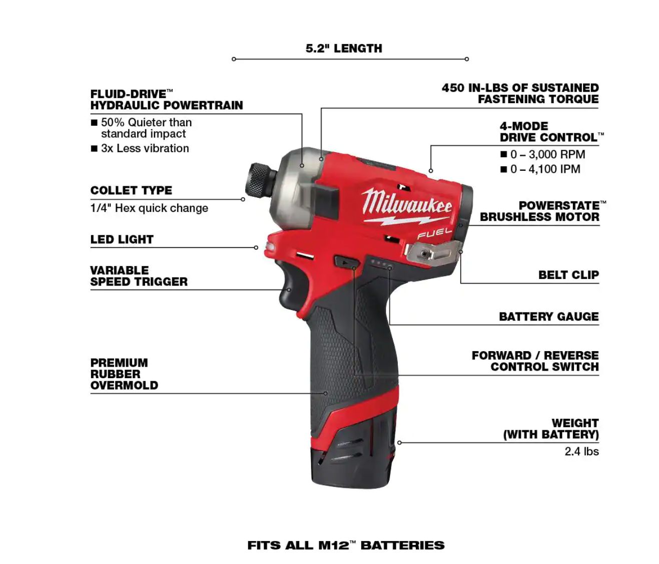 Milwaukee 2551-22-2364-20 M12 FUEL SURGE 12V Lithium-Ion Brushless Cordless 1/4 in. Hex Impact Driver Compact Kit with M12 Flood Light