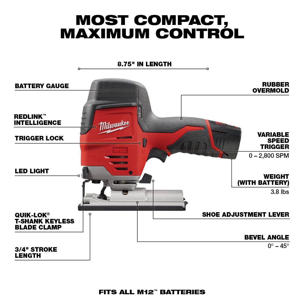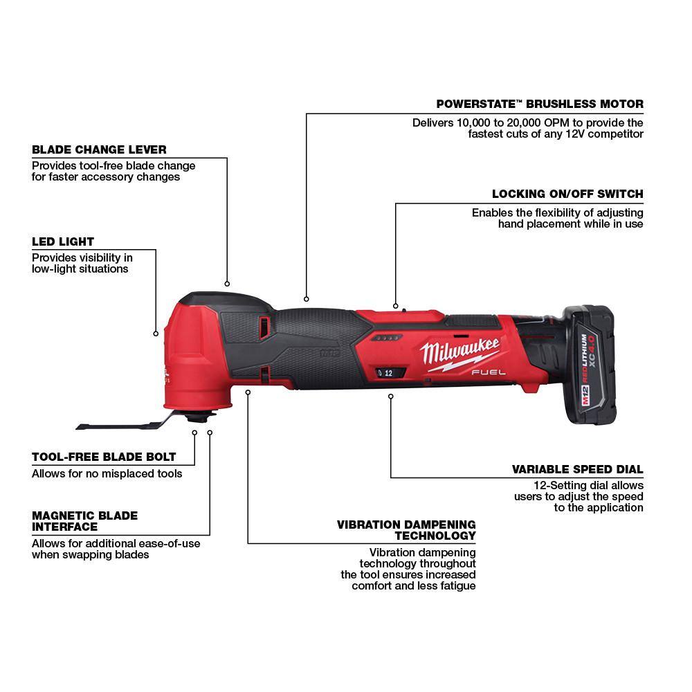 Milwaukee 2526-21XC-2415-20-2445-20-48-11-2460 M12 FUEL 12V Lithium-Ion Cordless Oscillating Multi-Tool Kit with 3/8 in. Right Angle Drill. Jig Saw & 6.0Ah Battery