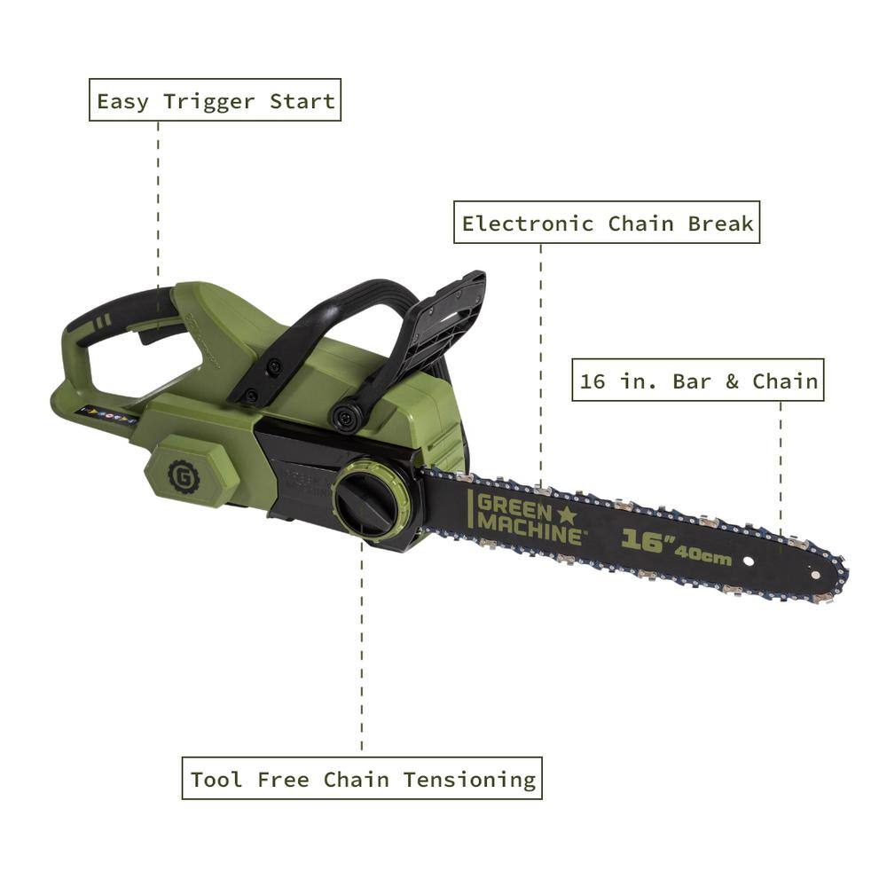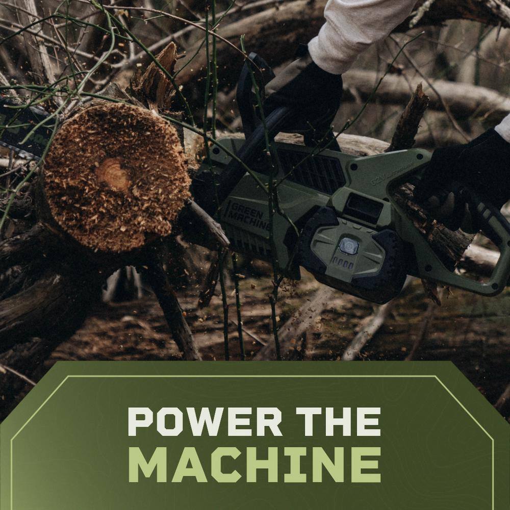 Green Machine GMCS6200 62V Brushless 16 in. Battery Chainsaw Auto-tensioning system. easy trigger start with 4 Ah Battery and Charger