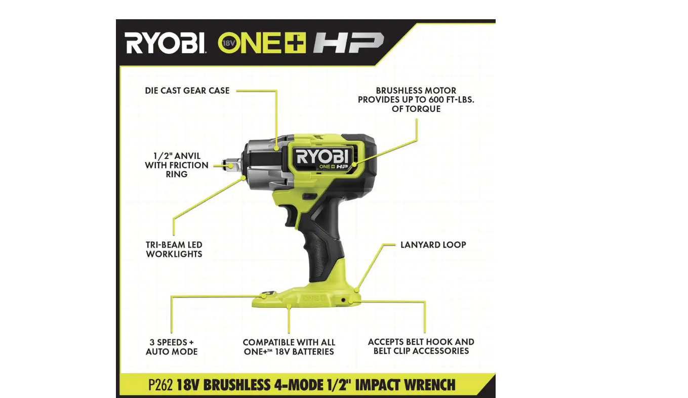 RYOBI P262K1 ONE+ HP 18V Brushless Cordless 4-Mode 1/2 in. Impact Wrench Kit w/ 4.0 Ah HIGH PERFORMANCE Lithium-Ion Battery & Charger