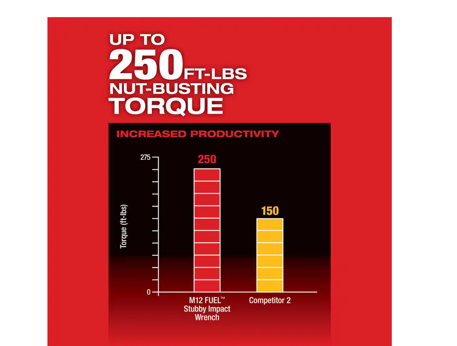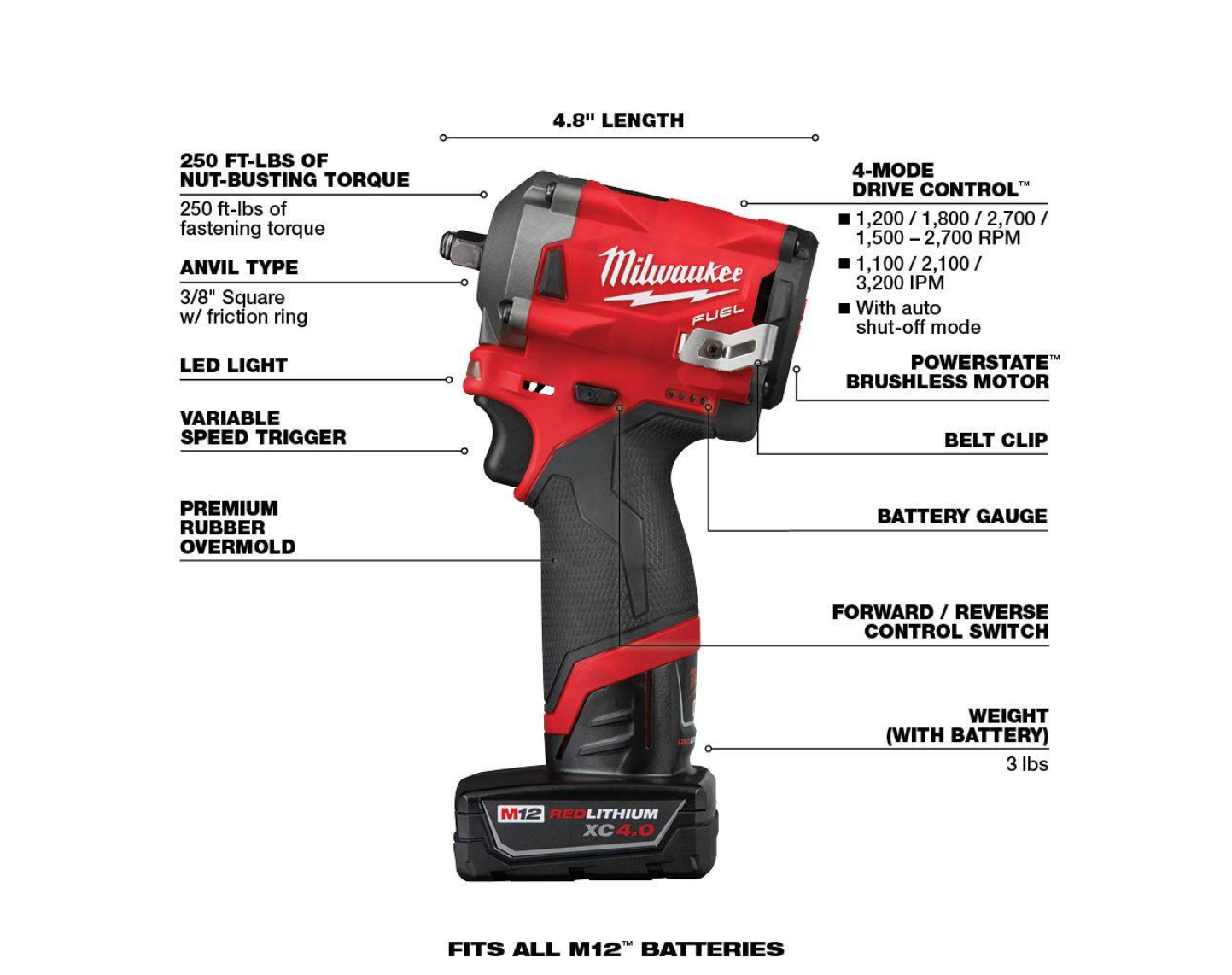 Milwaukee 2554-22-2446-20 M12 FUEL 12V Lithium-Ion Cordless Stubby 3/8 in. Impact Wrench Kit with Grease Gun. One 4.0 and One 2.0Ah Battery