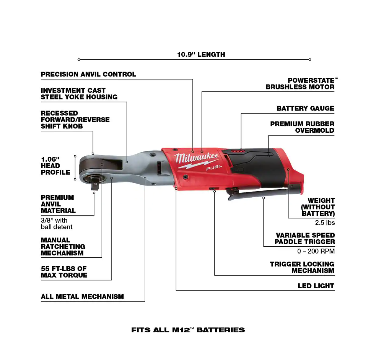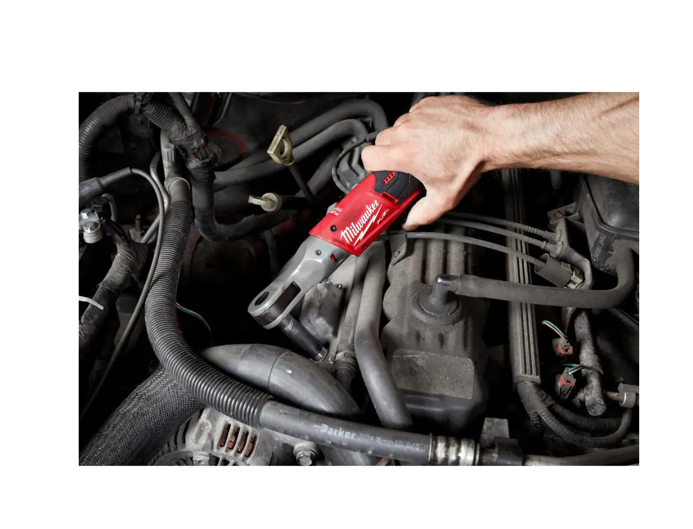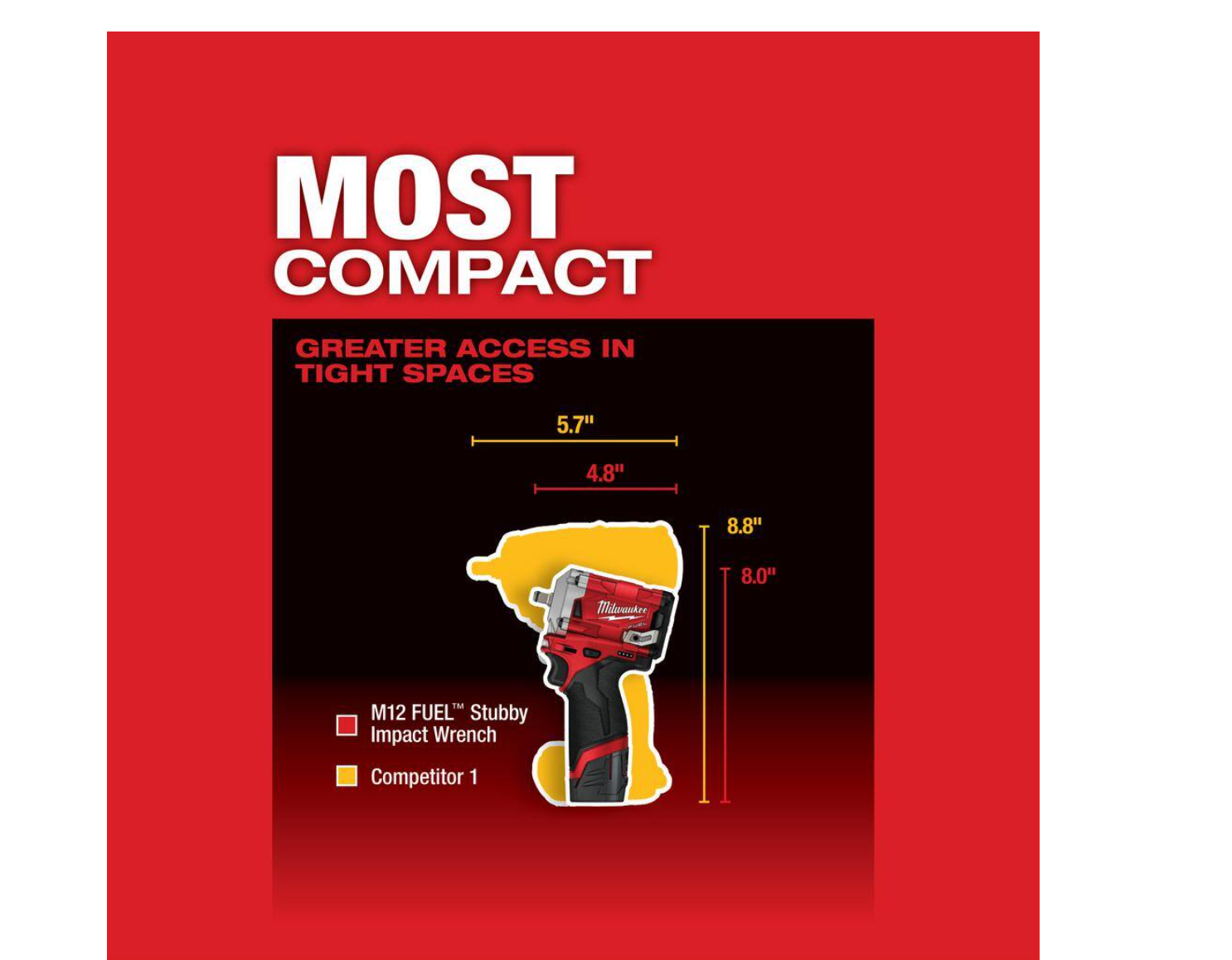 Milwaukee 2554-20-2557-20-48-11-2412 M12 FUEL 12V Lithium-Ion Brushless Cordless Stubby 3/8 in. Impact Wrench & 3/8 in. Ratchet with two 3.0 Ah Batteries
